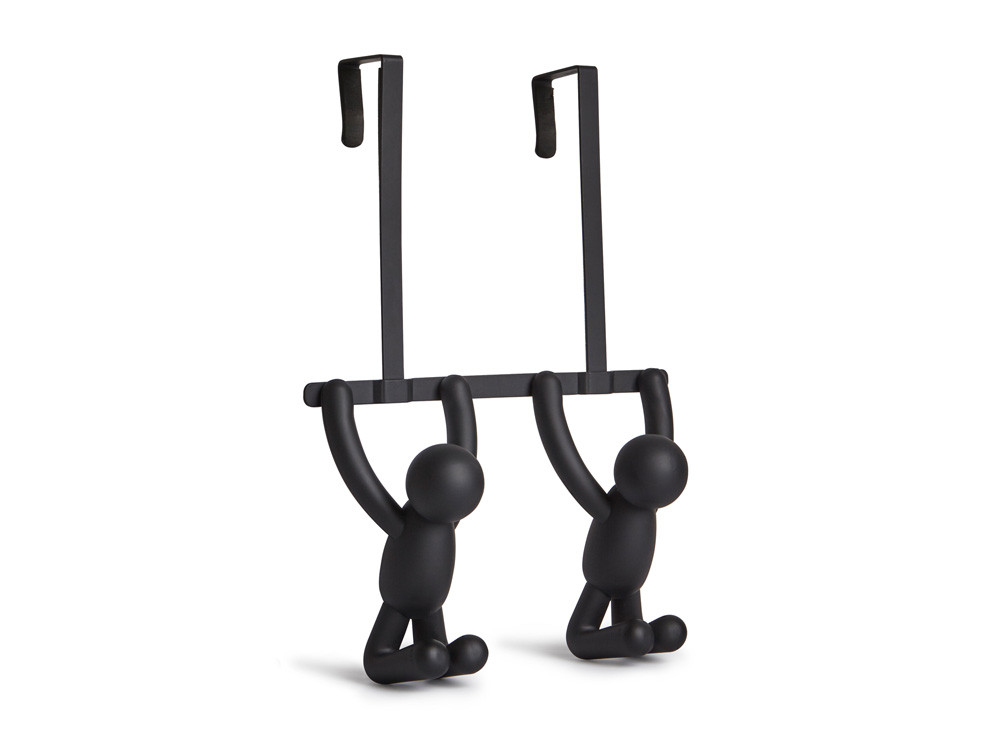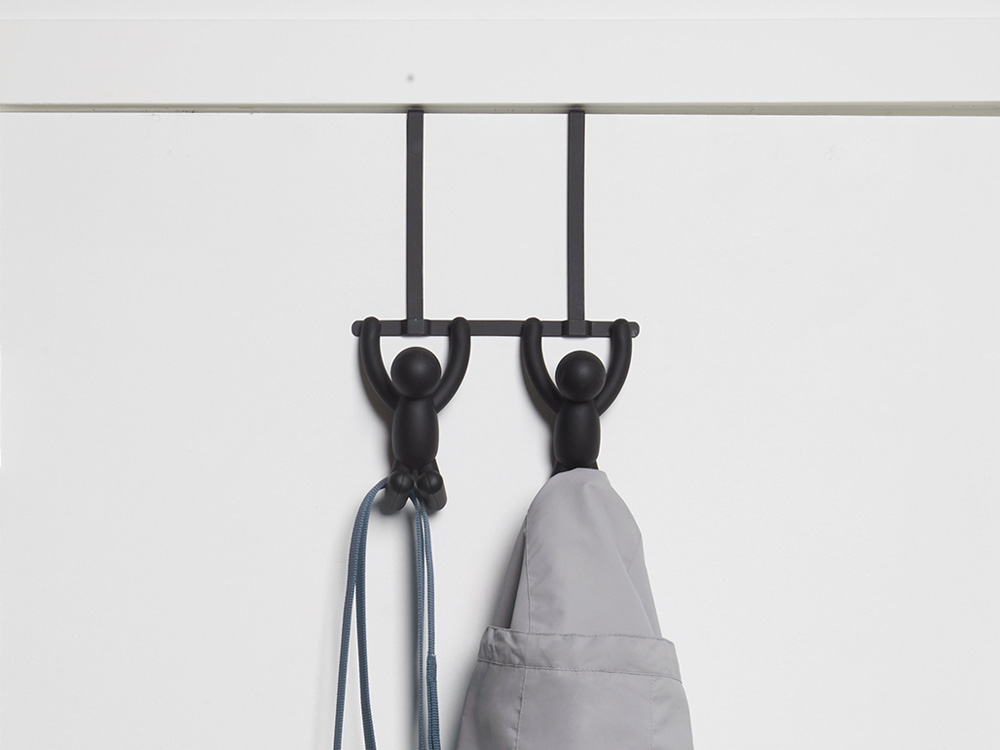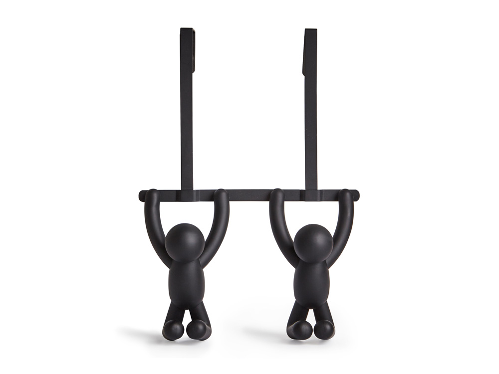 Oryginalny wieszak na ubrania z dwoma haczykami w kształcie "ludzików" podciągających się na drążku.