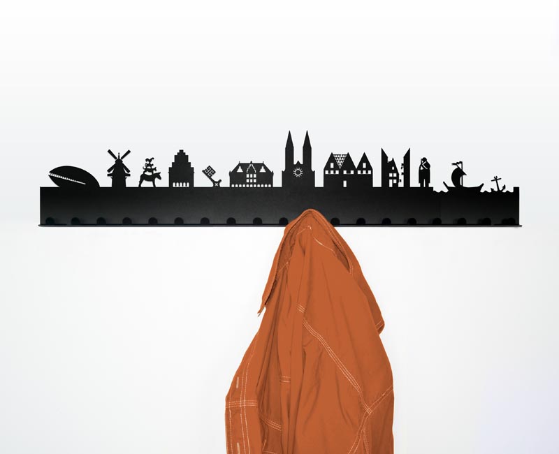 Baza wieszaka to wycięte laserowo kształty charakterystycznych dla miasta elementów. Dodatkowo wieszak posiada 19 pojedynczych wieszaczków na ubrania.