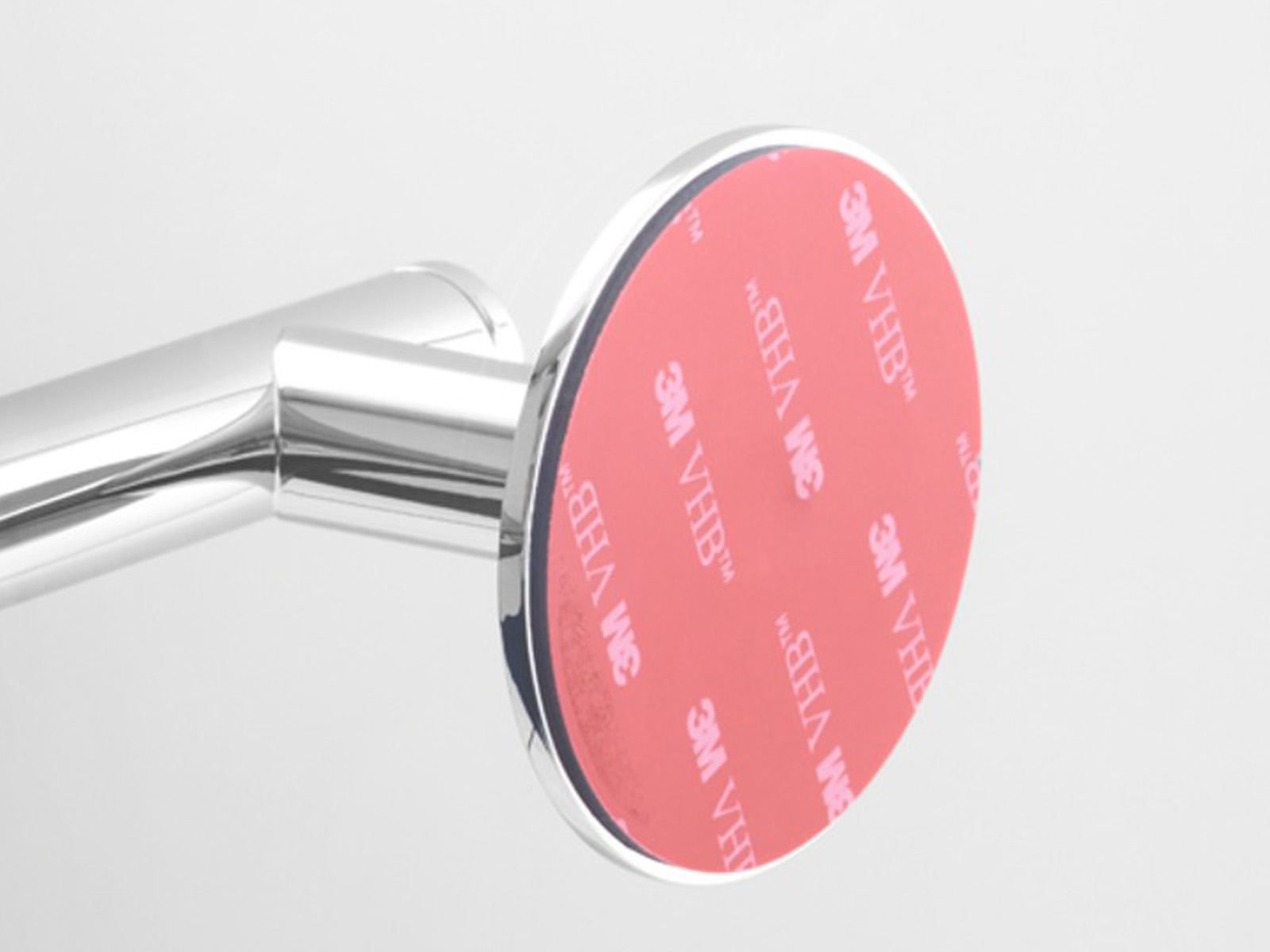 Wieszak do bezinwazyjnego montażu na płytkach, szkle lub innej gładkiej powierzchni za pomocą warstwy samoprzylepnej umieszczonej na uchwytach wieszaka.