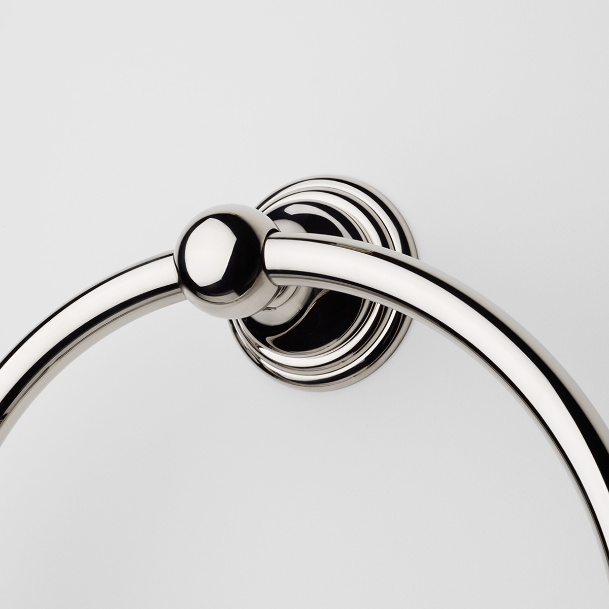 Elegancki ścienny wieszak obręcz na ręczniki z ozdobnym mocowaniem.