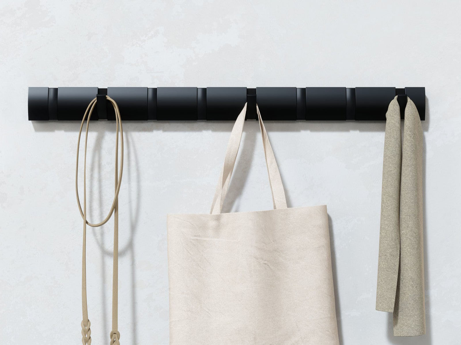 Elegancki drewniany wieszak ścienny z 8-oma odchylanymi metalowymi haczykami. Wieszak kiedy nie jest używany przypomina ozdobioną metalowymi wstawkami listwę dekoracyjną.
