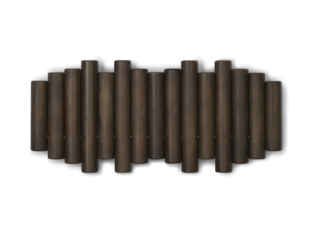 Ubraniowy wieszak ścienny w kształcie kompozycji różnej długości połączonych ze sobą kołków z drewna sosnowego.