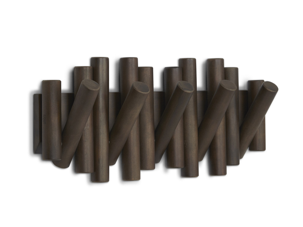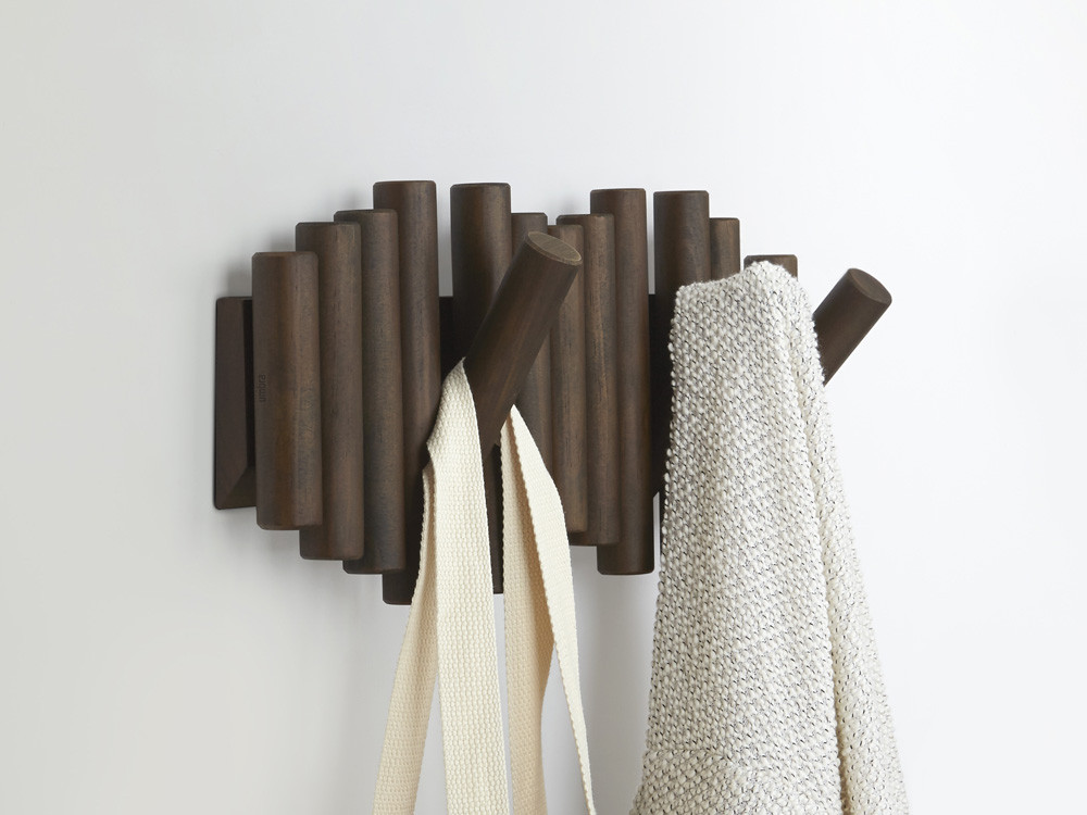 Wieszak wykonany z naturalnego barwionego drewna - maksymalne obciążenie każdego haczyka do 2,3 kg.