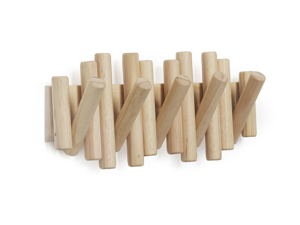 Ubraniowy wieszak ścienny w kształcie kompozycji różnej długości połączonych ze sobą kołków z drewna sosnowego.