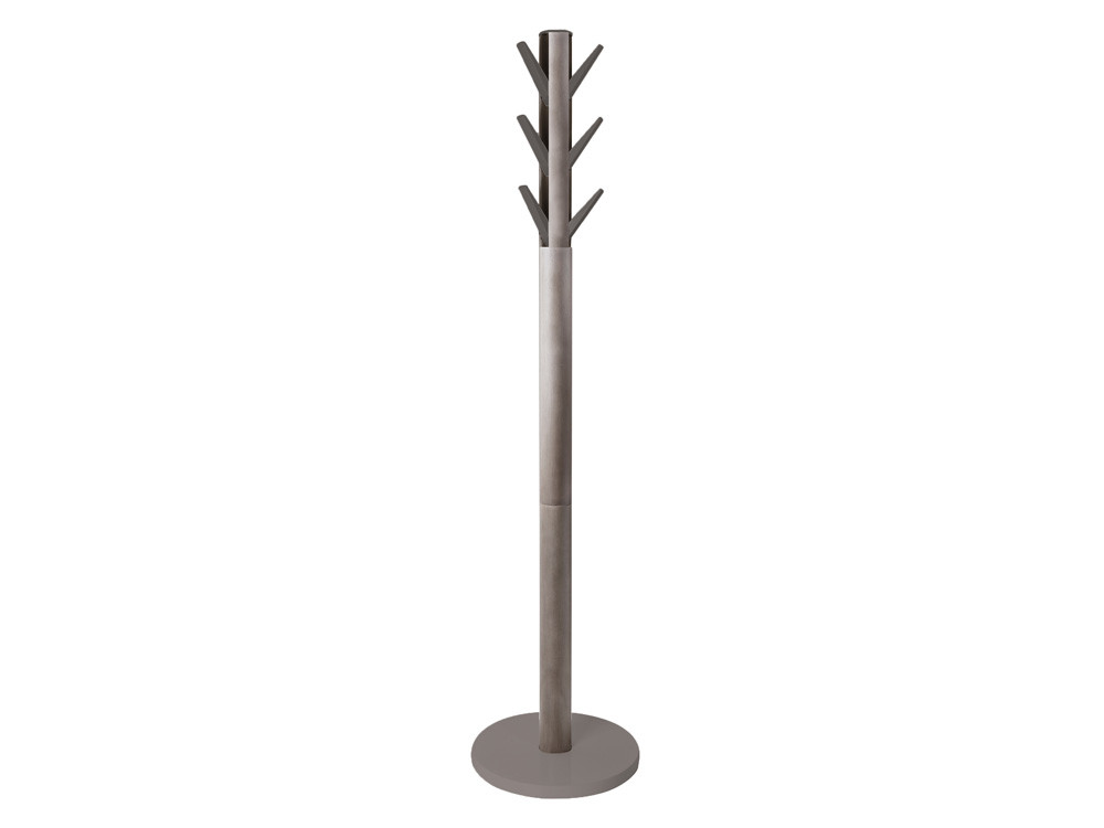 Słupek wieszaka wykonany z drewna kauczukowego w kolorze szarym, osadzony na stabilnej okrągłej metalowej podstawie.