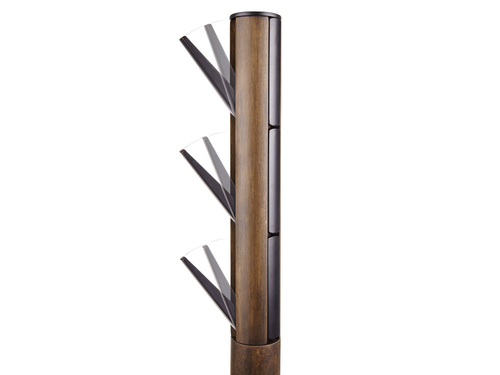 Słupek wieszaka wykonany z drewna kauczukowego w kolorze ciemnego orzecha, osadzony na stabilnej okrągłej metalowej podstawie.