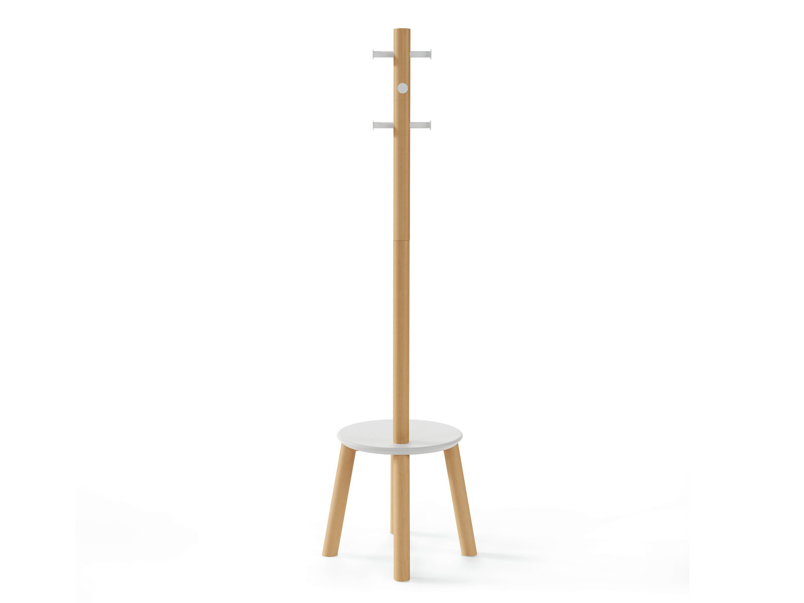 Oryginalny wysoki wolnostojący drewniany wieszak na ubrania z okrągłym stołkiem.