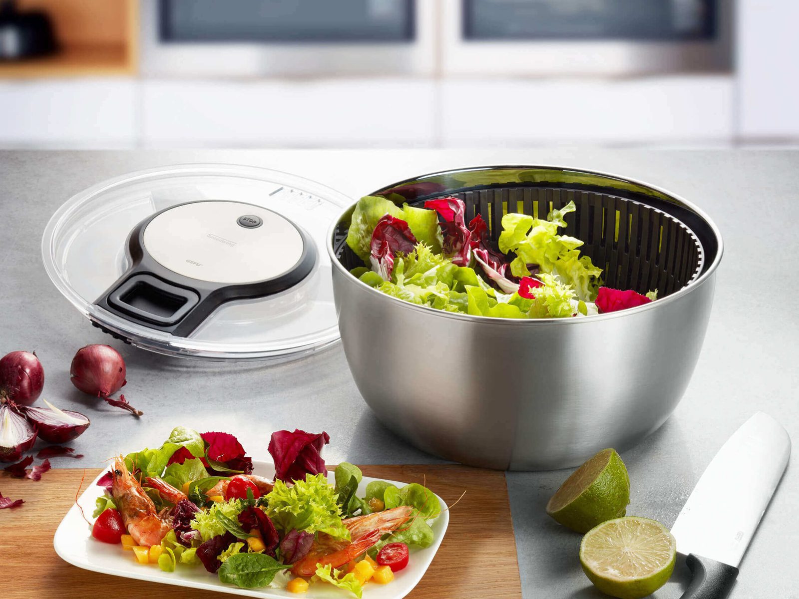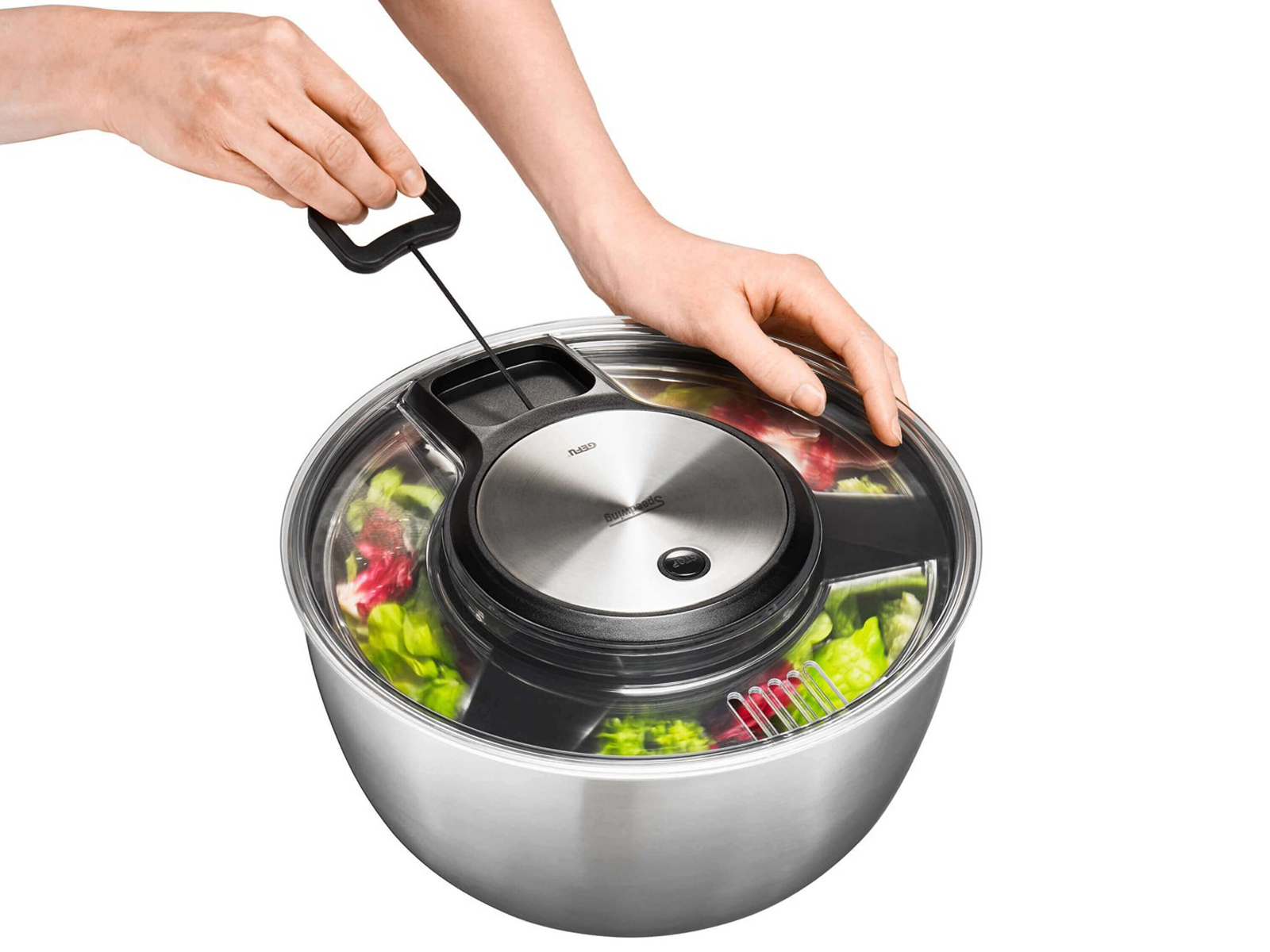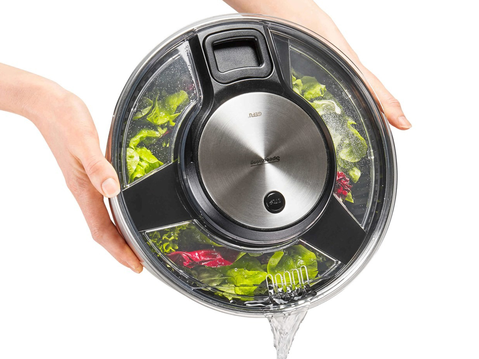 Z wirówką GEFU Speedwing można raz na zawsze przestać się martwić o mokrą sałatę na talerzu.