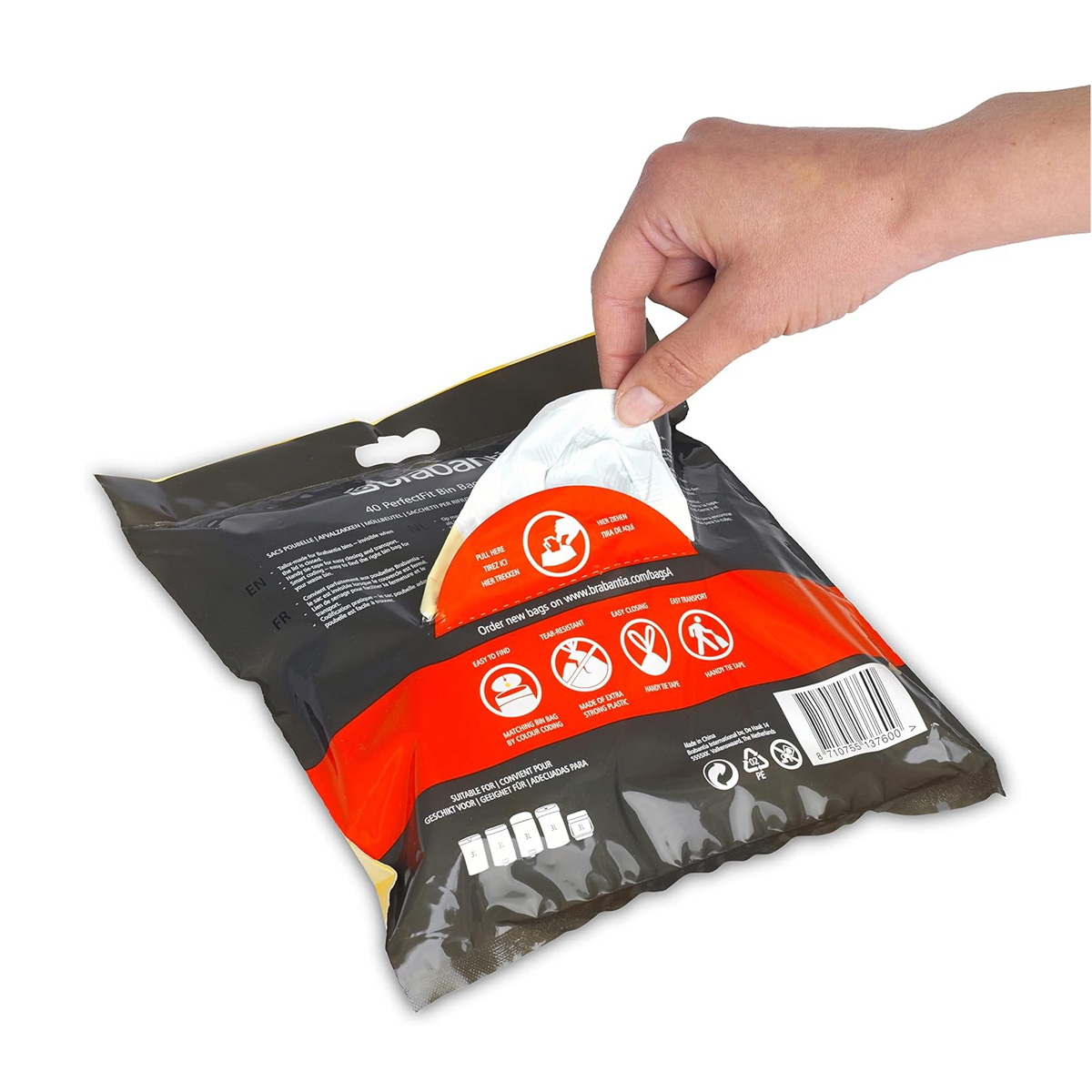 Wielkość worków idealnie dopasowana do koszy marki Brabantia, każdy kosz na wewnętrznej stronie pokrywy posiada oznaczenie rozmiaru worka pasującego do jego wielkości.