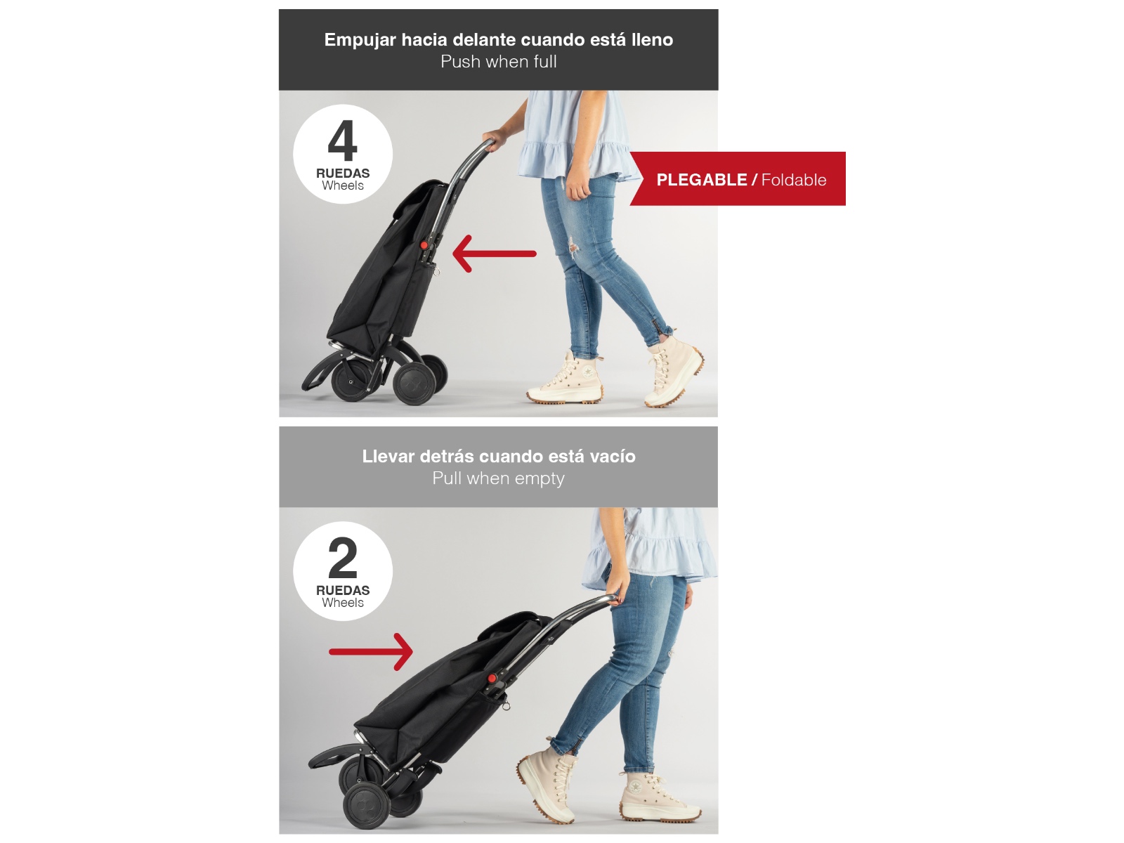 Rolser I-Max 4L to zwinny i bardzo pojemny dwukierunkowy wózek na zakupy - idealny, aby wygodnie wrócić do domu z torbami pełnymi zakupów. Jest to zaawansowany model posiadający 4 kółka i pozwalający na ruch dwukierunkowy. W pozycji z dwoma kółkami można go wygodnie ciągnąć za sobą, a przy czterech kółkach, pchać przed sobą.