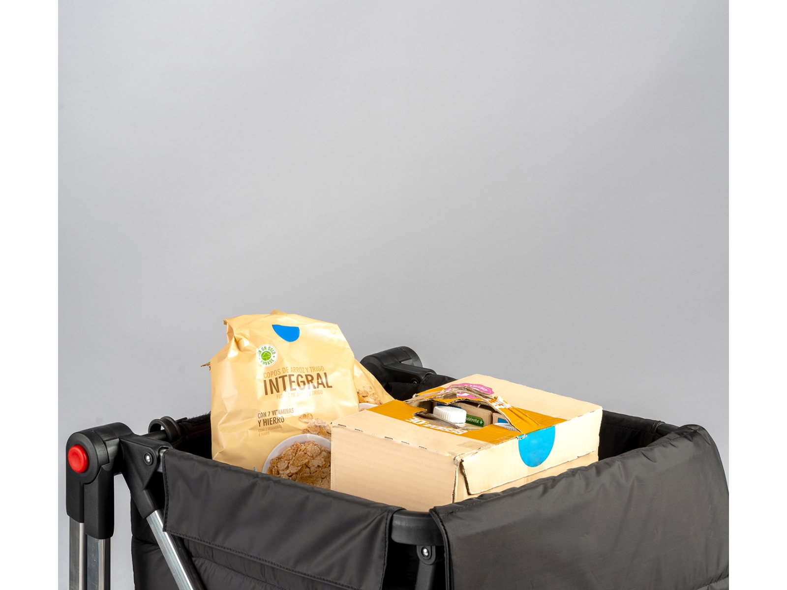 Wózek posiada wbudowany podnóżek, który pozwalana łatwiejsze pokonywanie schodów, krawężników lub innych zmian wysokości drogi. Aluminiowy stelaż jest wytrzymały, a a torbę można szybko i łatwo odpiąć.