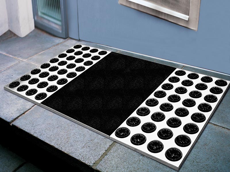 Wycieraczka FeetBack posiada 64 unikalne szczotki, które niezwykle skutecznie usuwają brud z podeszw butów oraz cenralnie ułożoną jednolitą matę do codzinnego usuwania kurzu i delikatnego zabrudzenia z obuwia.