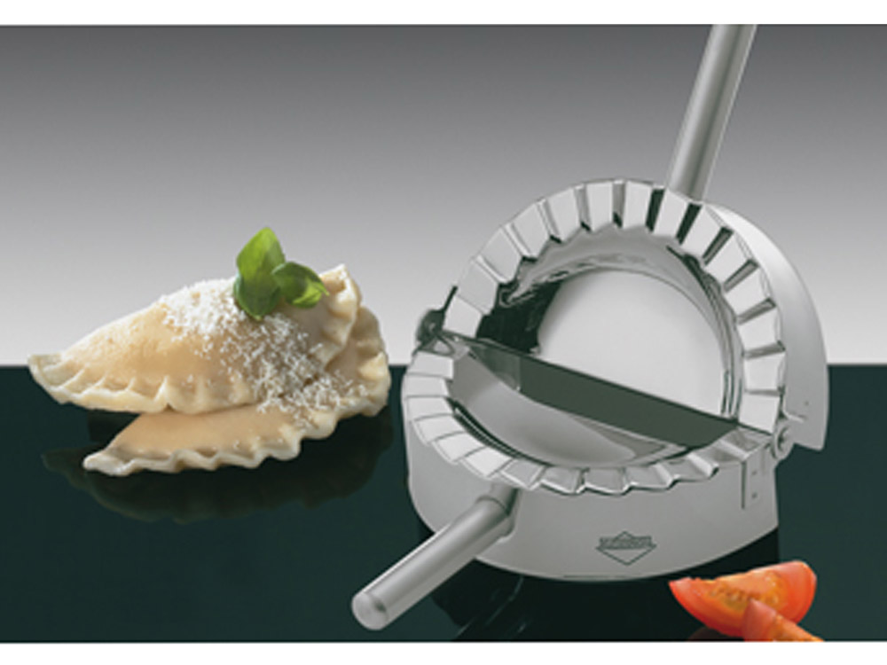 Dwustronne składane narzędzie służy do wykrawania krążków z ciasta pierogowego oraz dzięki specjalnie wyprofilowanej powierzchni sklejania ciasta wraz z farszem w kształt pierożków z ozdobnym brzegiem.
