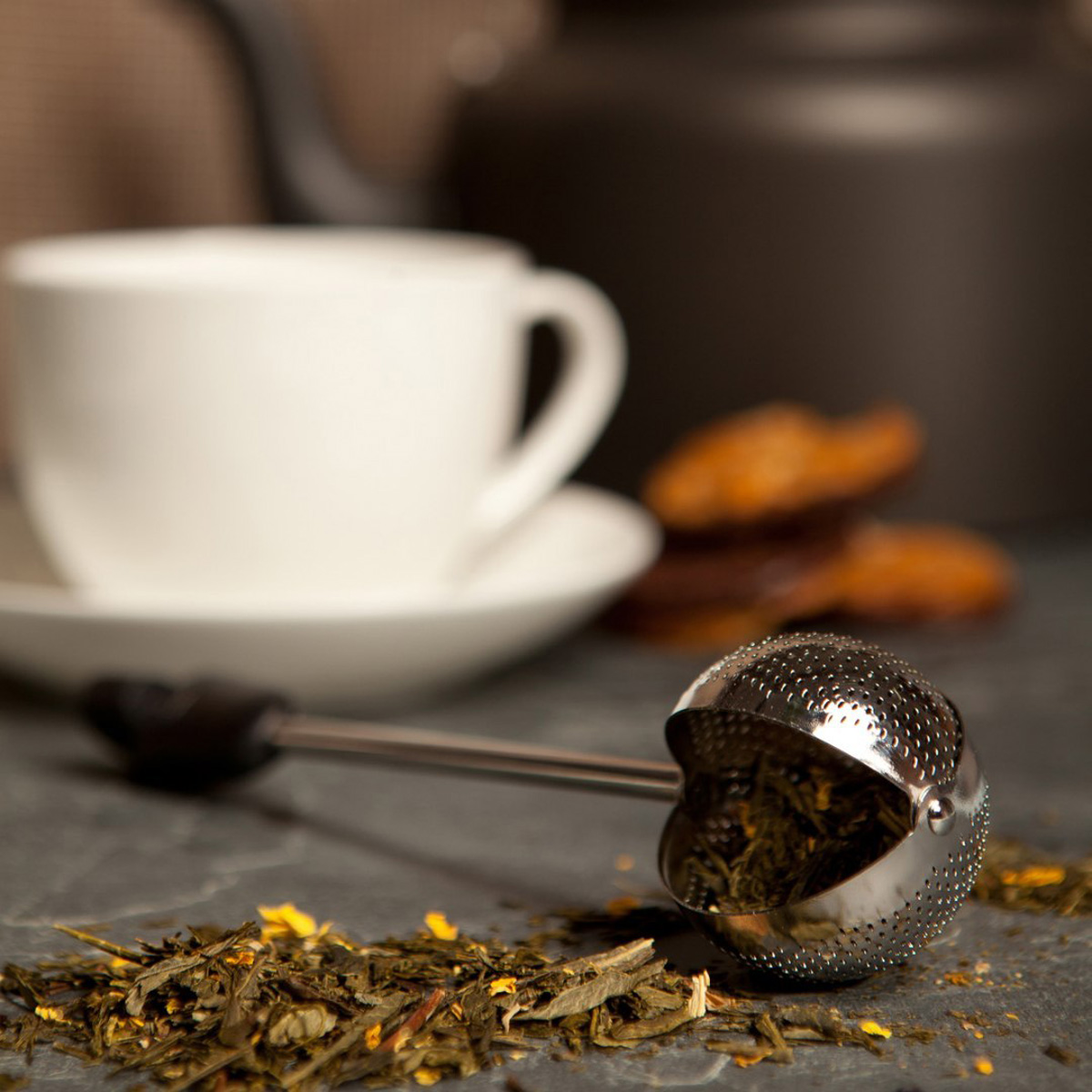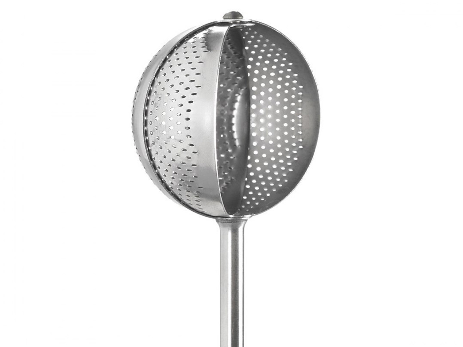 Elegancki metalowy zaparzacz do herbaty i mieszanek ziołowych z kulistym perforowanym koszyczkiem oraz długą wąską rączką zakończoną niewielkim uchwytem.