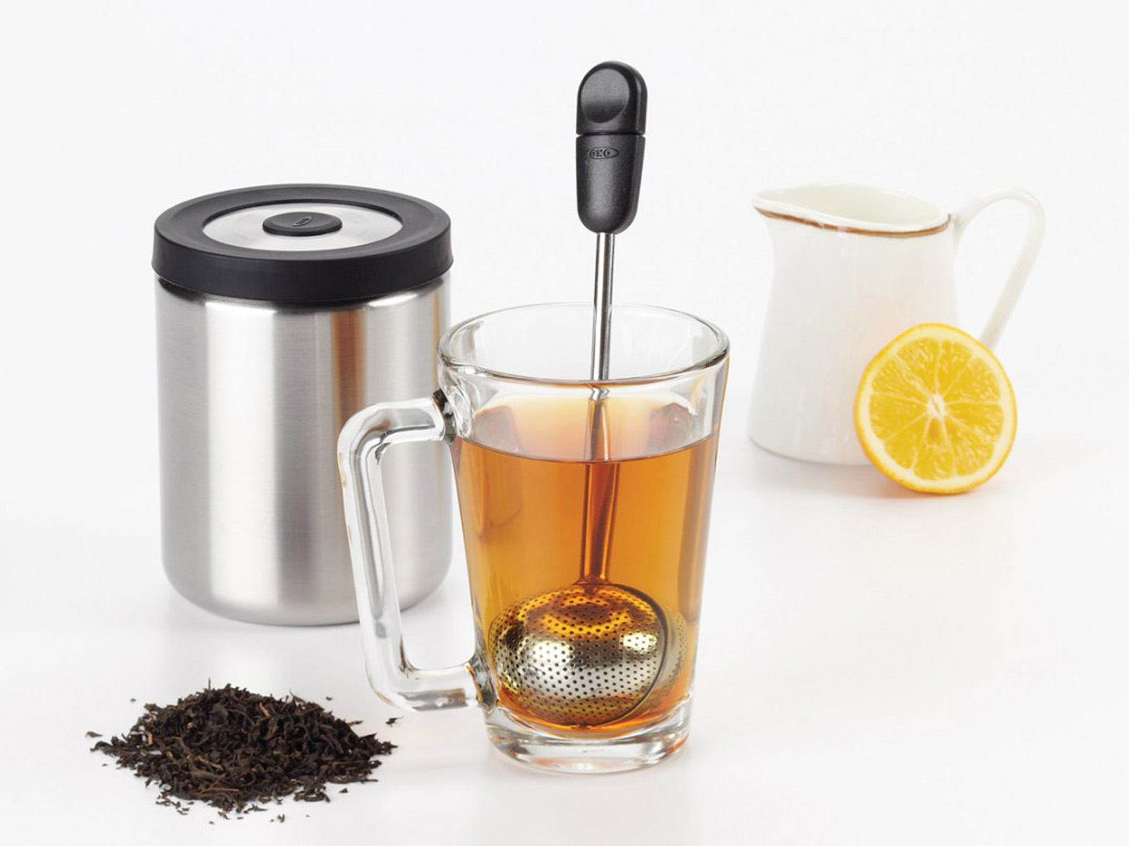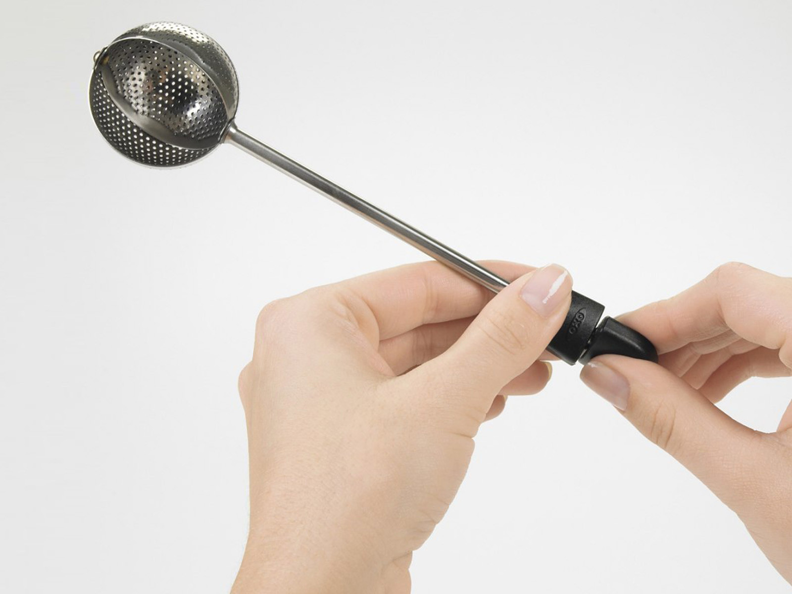 Uchwyt wykonany z tworzywa sztucznego posiada pokrętło, którego przesunięcie w dowolną stronę umożliwia otworzenie koszyczka na kształt łyżeczki i łatwe napełnienie zaparzacza liśćmi lub granulkami herbaty bezpośrednio z opakowania, a następnie jego dokładne zamknięcie.