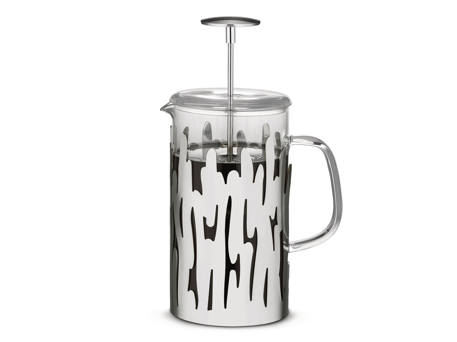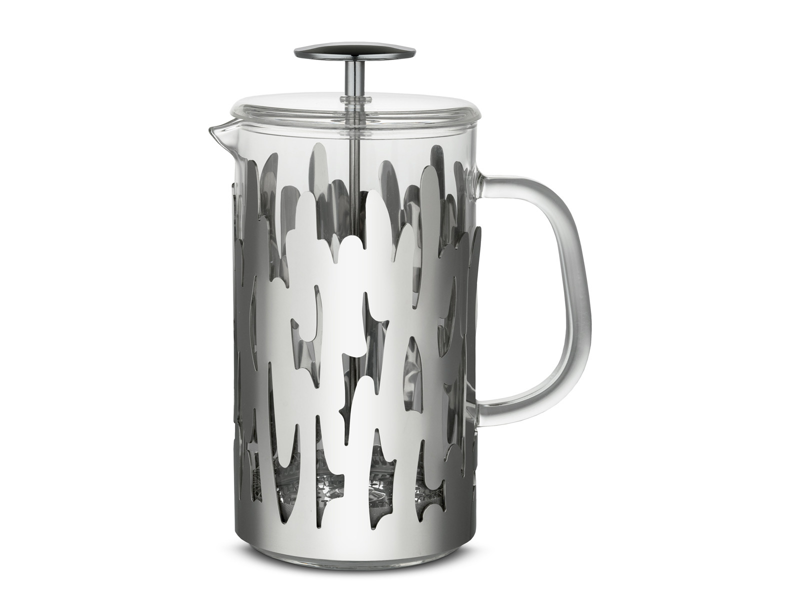 Alessi Barkoffee to oryginalny dzbanek/zaparzacz tłokowy do herbaty, który wyróżnia się nowoczesnym wzornictwem inspirowanym organicznymi formami, widocznymi w stalowej konstrukcji otaczającej żaroodporny szklany pojemnik, co dodaje całości wyjątkowej elegancji. W zestawie znajduje się również filtr, umożliwiający przygotowanie kawy o różnorodnym smaku – od mocnego espresso po kawy zaparzane z użyciem systemu Melitta (papierowe filtry).