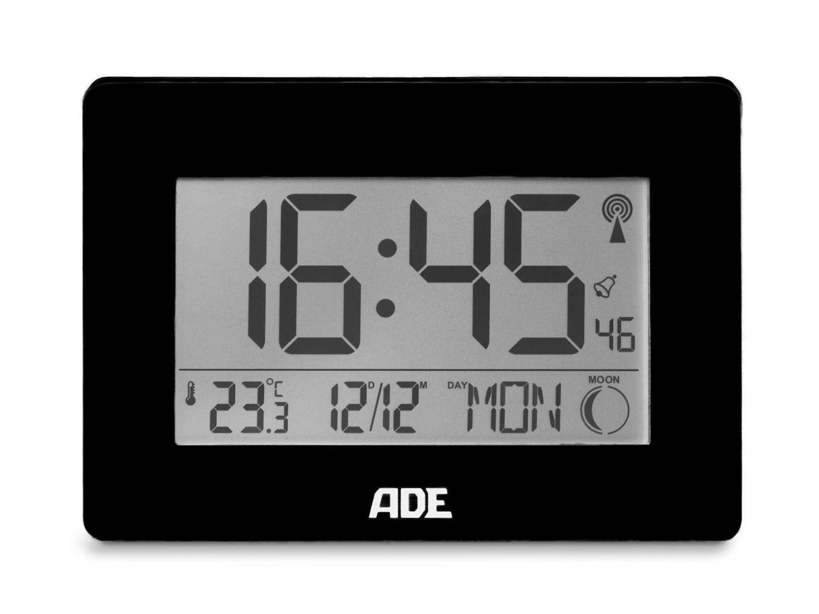 Zegar elektroniczny ADE to funkcjonalne urządzenie w rozmiarze XXL, którego duży wyświetlacz ułatwia odczyt godziny nawet z większej odległości. Czas może być ustawiony ręcznie lub automatycznie dzięki sygnałowi radiowemu, z uwzględnieniem zmiany pomiędzy czasem letnim a zimowym. Model został wyposażony w budzik z funkcją drzemki, termometr prezentujący temperaturę pomieszczenia w °C i °F , a także kalendarz z dniem tygodnia w 7 językach. Dodatkowym atutem jest funkcja wyświetlania faz księżyca. Zegar można zarówno postawić, jak i powiesić na ścianie.