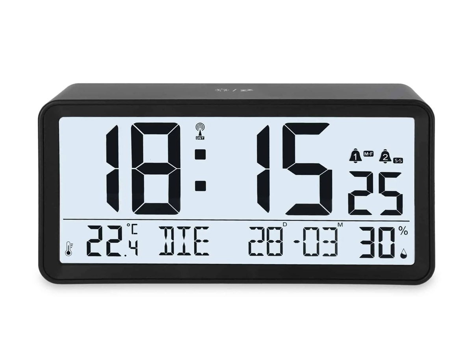 Zegar elektroniczny ADE to wszechstronne urządzenie z dużym ekranem, które umożliwia łatwy odczyt godziny z dużej odległości. Model posiada funkcję budzika z drzemką i możliwością ustawienia 2 oddzielnych alarmów oraz czas budzenia dopasowujący się do dni tygodnia – od poniedziałku do piątku, w weekendy lub codziennie. Czas ustawiany jest automatycznie dzięki sygnałowi radiowemu. Wskaźnik poziomu baterii poinformuje o potrzebie naładowania. Podświetlenie ekranu uruchamia się na około 10 sekund po naciśnięciu przycisku. Zegar wyświetla temperaturę w pomieszczeniu w °C i °F, poziom wilgotności powietrza oraz datę z dniem tygodnia w 7 językach. Dodatkowo, urządzenie można zarówno powiesić na ścianie, jak i postawić na blacie.