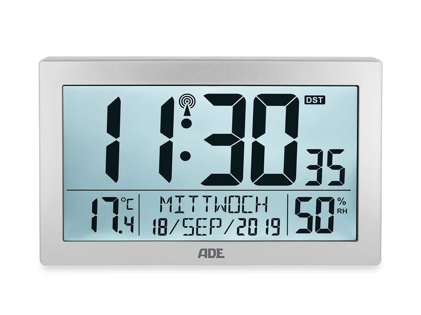 Zegar elektroniczny ADE to wszechstronne urządzenie z dużym ekranem, które umożliwia łatwy odczyt godziny z dużej odległości. Model posiada funkcję budzika z drzemką i możliwością ustawienia 2 oddzielnych alarmów. Czas ustawiany jest automatycznie dzięki sygnałowi radiowemu. Zegar wyświetla temperaturę w pomieszczeniu w °C, poziom wilgotności powietrza oraz kalendarz z dniem tygodnia w 7 językach. Dodatkowo, urządzenie można zarówno powiesić na ścianie, jak i postawić na blacie.