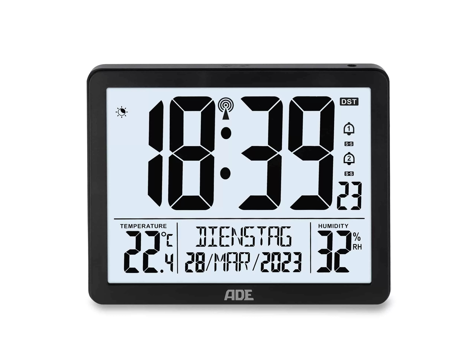 Zegar elektroniczny ADE to wszechstronne urządzenie z dużym ekranem XL o wysokim kontraście, które umożliwia łatwy odczyt godziny z dużej odległości. Model posiada funkcję budzika z drzemką i możliwością ustawienia 2 oddzielnych alarmów oraz czas budzenia dopasowujący się do dni tygodnia – od poniedziałku do piątku, w weekendy lub codziennie. Czas ustawiany jest automatycznie dzięki sygnałowi radiowemu. Podświetlenie ekranu uruchamia się na około 8 sekund po naciśnięciu przycisku, a wykrywacz poziomu światła automatycznie zmniejsza jego intensywność w nocy, aby nie drażnić oczu. Zegar wyświetla temperaturę w pomieszczeniu w °C i °F , poziom wilgotności powietrza oraz kalendarz w 7 językach. Dodatkowo, urządzenie można zarówno powiesić na ścianie, jak i postawić na blacie.