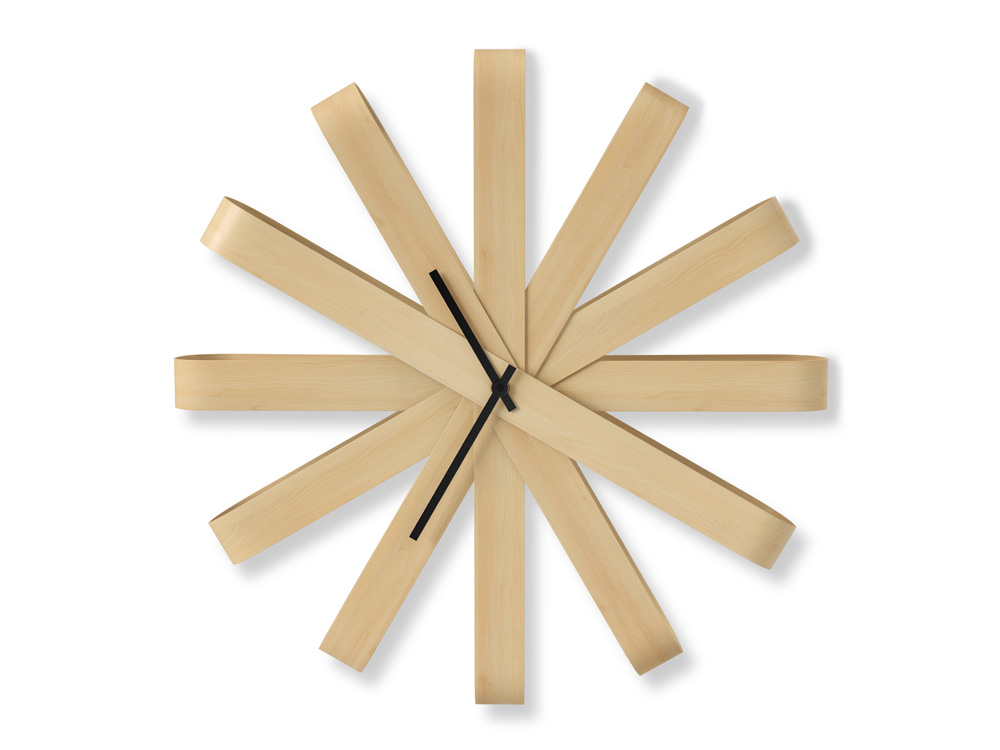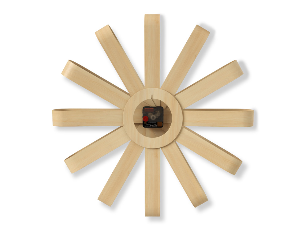 Tarcza zegara bez znaczników godzinowych wykonana jest z pasów giętego drewna bukowego w naturalnym kolorze, przecinających się pośrodku i układających się w koło.