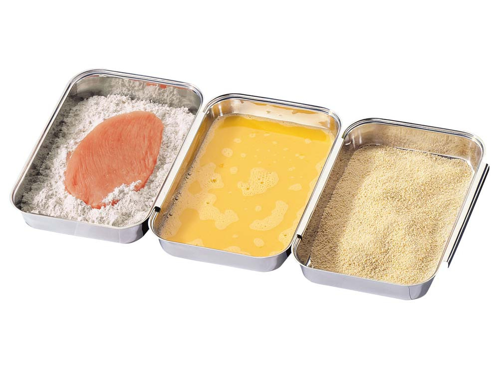 Praktyczny zestaw trzech prostokątnych miseczek do panierowania z wysokiej jakości stali nierdzewnej.