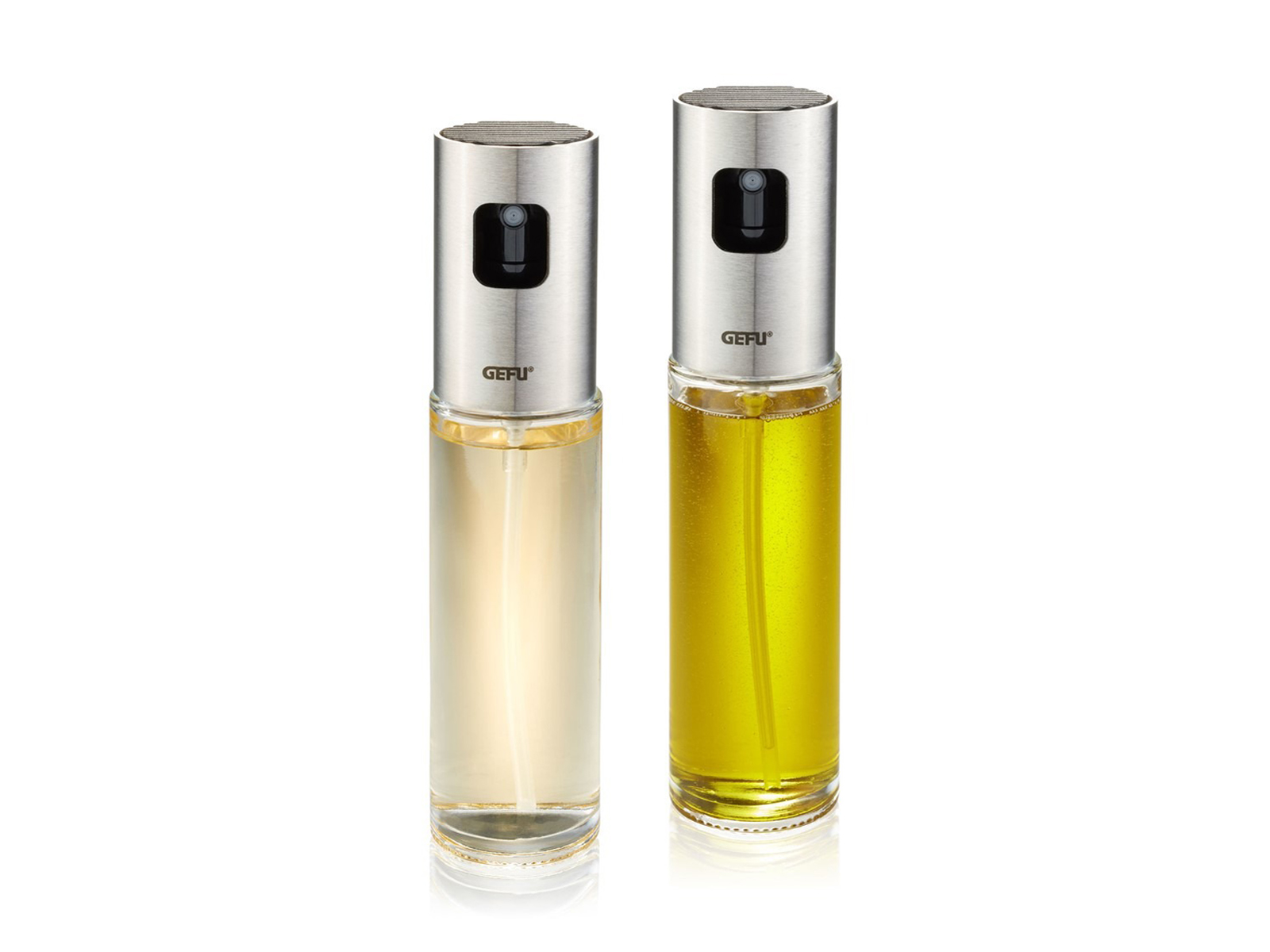 Zestaw 2 butelek na ocet i oliwę GEFU Neva to elegancki i funkcjonalny komplet, który ułatwia codzienne przyprawianie dań. Każda butelka wyposażona jest w wygodny rozpylacz umożliwiający równomierne rozprowadzanie płynów jednym naciśnięciem przycisku. Idealne do zdrowego grillowania, pieczenia, smażenia lub przygotowywania sałatek, pozwalają ograniczyć ilość tłuszczu z zachowaniem pełni smaku. Butelki są szczelne i przystosowane do mycia w zmywarce. Konstrukcja ze szkła, stali nierdzewnej i tworzywa sztucznego sprawia, że przyprawy prezentują się estetycznie i elegancko, a w dodatku są bezpiecznie przechowywane.