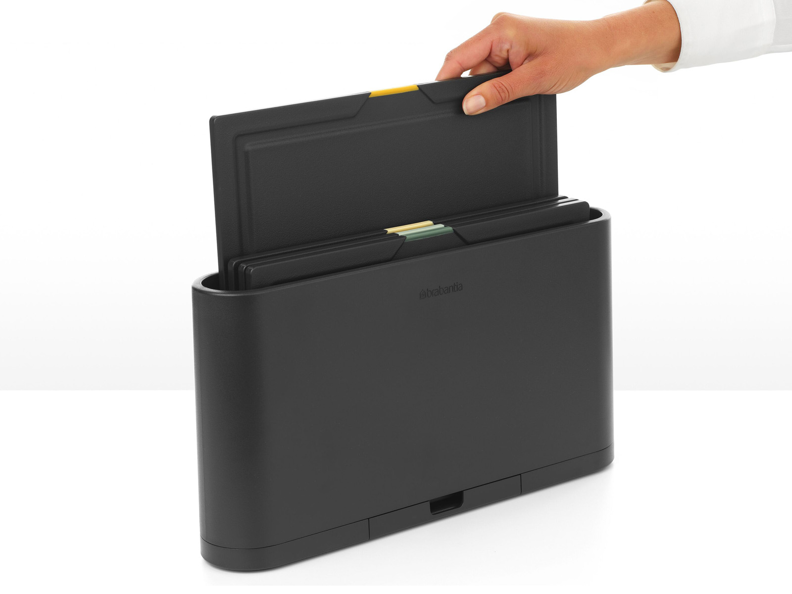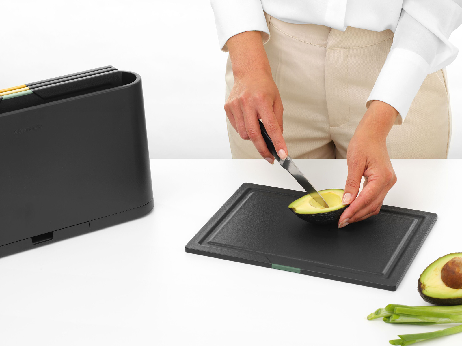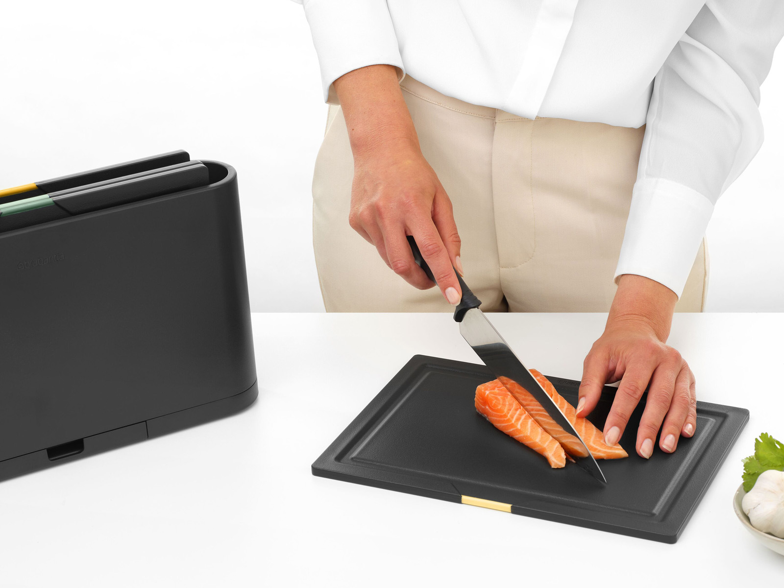 Brabantia Tasty+ to elegancki i praktyczny kuchenny zestaw desek do krojenia z nablatowym stojakiem do ich przechowywania. Zestaw zawiera 4 prostokątne deski do krojenia o wymiarach 21x30 cm wykonane z tworzywa sztucznego wolnego od BPA.