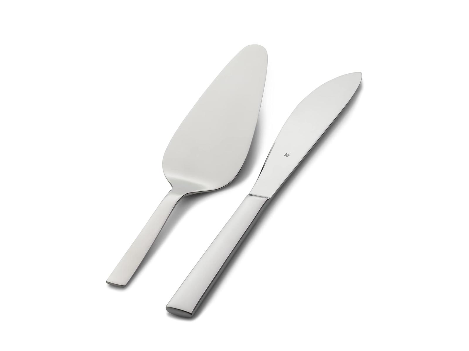 Elegancki 2-elementowy zestaw do serwowania ciasta i deserów złożony z noża o szerokim ostrzu oraz łopatki do nakładania pokrojonych porcji.