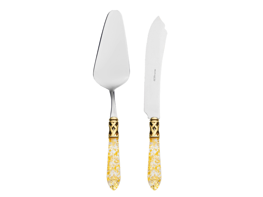 Piękny zestaw ozdobnych sztućców do serwowania ciasta i innych deserów złożony z noża o specjalnym kształcie i łopatki do nakładania.