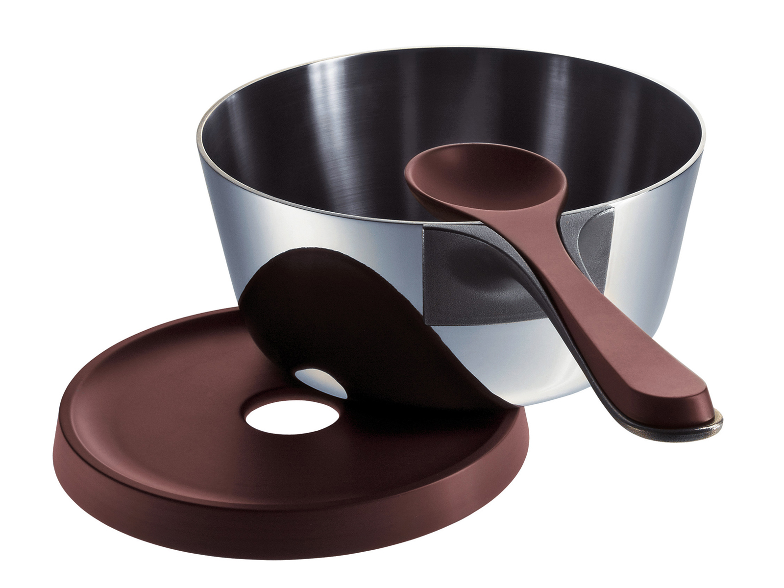Pokrywka i rondel wykonane są z wysokiej jakości stali nierdzewnej 18/10, polerowanej na lustro, z kolei łyżka i podkładka stworzone są z odpornej na uszkodzenia i temperaturę melaminy. Długą łyżkę można zamocować na uchwycie rondla, co zwiększa komfort użytkowania.