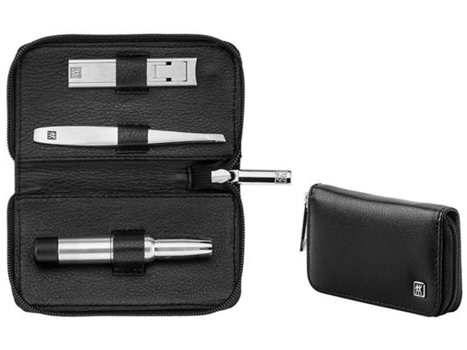 W skład zestawu wchodzą: pęseta ukośna, obcinacz Twin S, trymer do nosa i uszu oraz etui