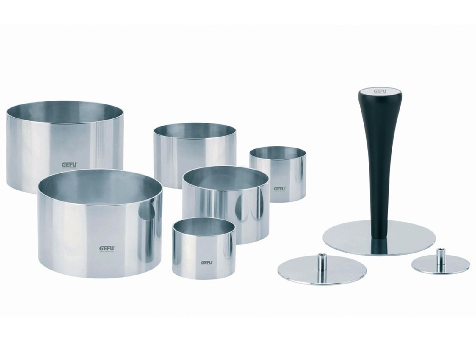 Zestaw GEFU Formidable to komplet 10 elementów, z którymi tworzenie pięknie ukształtowanych i efektownych deserów nie będzie już żadnym problemem. W skład zestawu wchodzą pierścienie w trzech rozmiarach – 4 cm, 6 cm i 8 cm średnicy, każda dostępna w 2 egzemplarzach. Do kompletu dołączone są 3 talerze z uniwersalnym uchwytem, które odpowiadają rozmiarom pierścieni. Po wybraniu talerza i doczepieniu go do uchwytu powstaje tłok, który niezwykle ułatwia formowanie stabilnych kształtów oraz wyjmowanie gotowych deserów. Różnorodność rozmiarów pozwala na planowanie kompozycji o dowolnych wysokościach i objętościach, a uniwersalność – na stosowanie nie tylko do deserów, ale i przystawek lub małych wypieków.