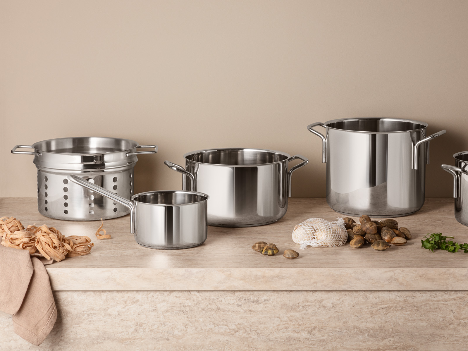 Zestaw zawiera 4 elementy: garnek do gotowania o pojemności 4,8 litra, garnek do gotowania o pojemności 3,6 litra, garnek/rondel o pojemności 1,8 litra oraz durszlak/ wkład do odcedzania makaronu