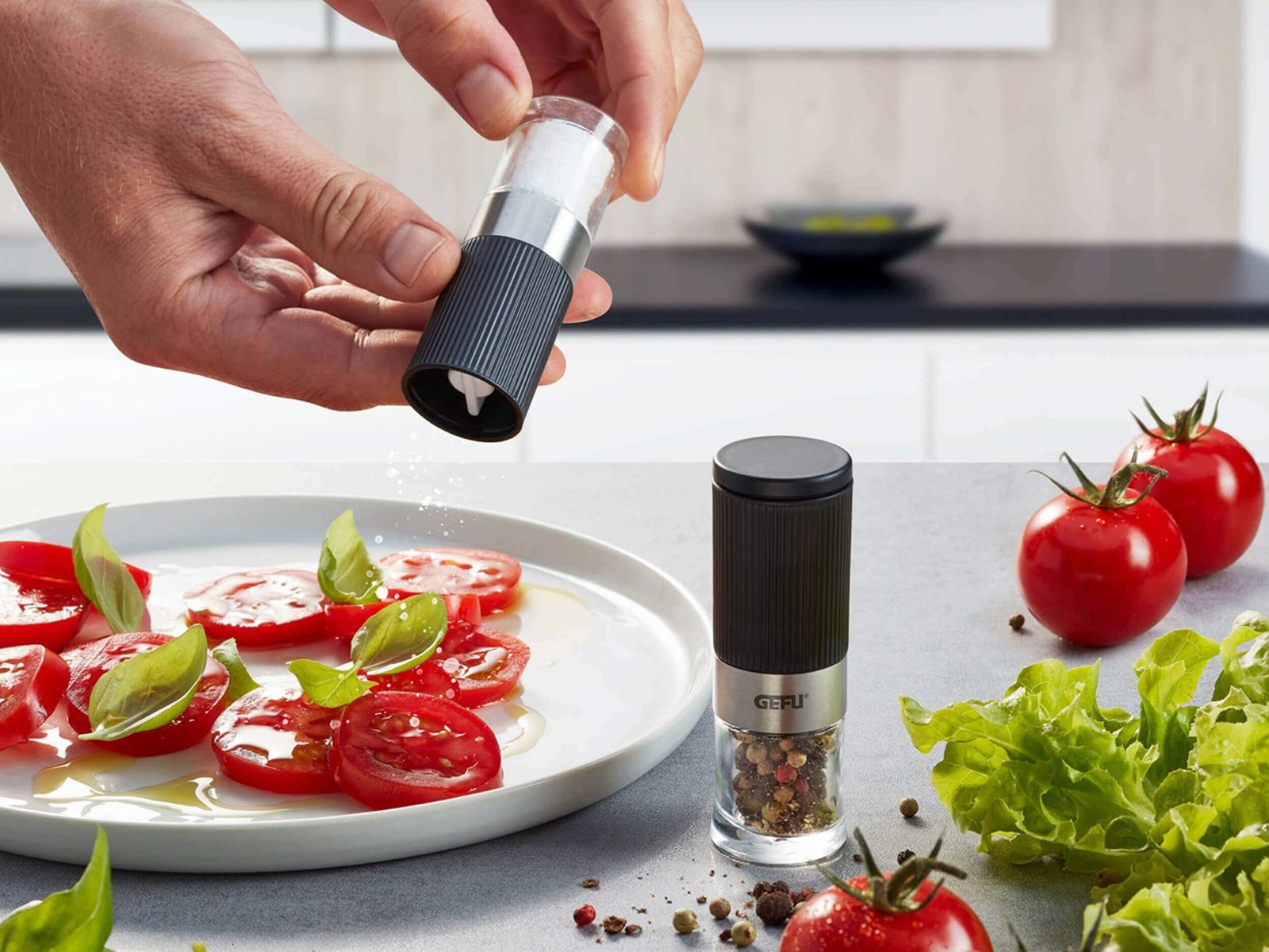 Zestaw 2 młynków GEFU Tusome zachwyca solidnym wykonaniem, niewielkim rozmiarem i dużą precyzją w przyprawianiu potraw.