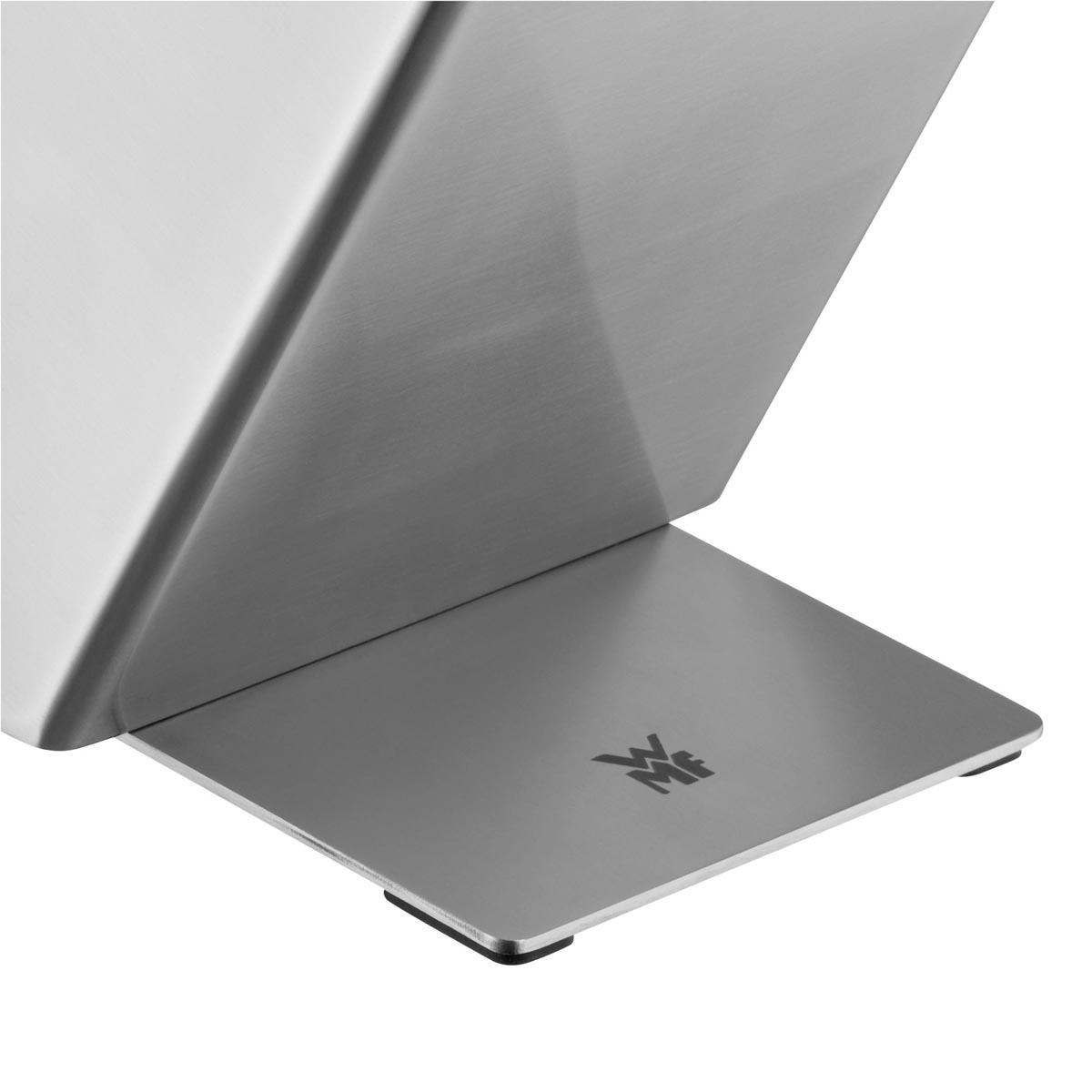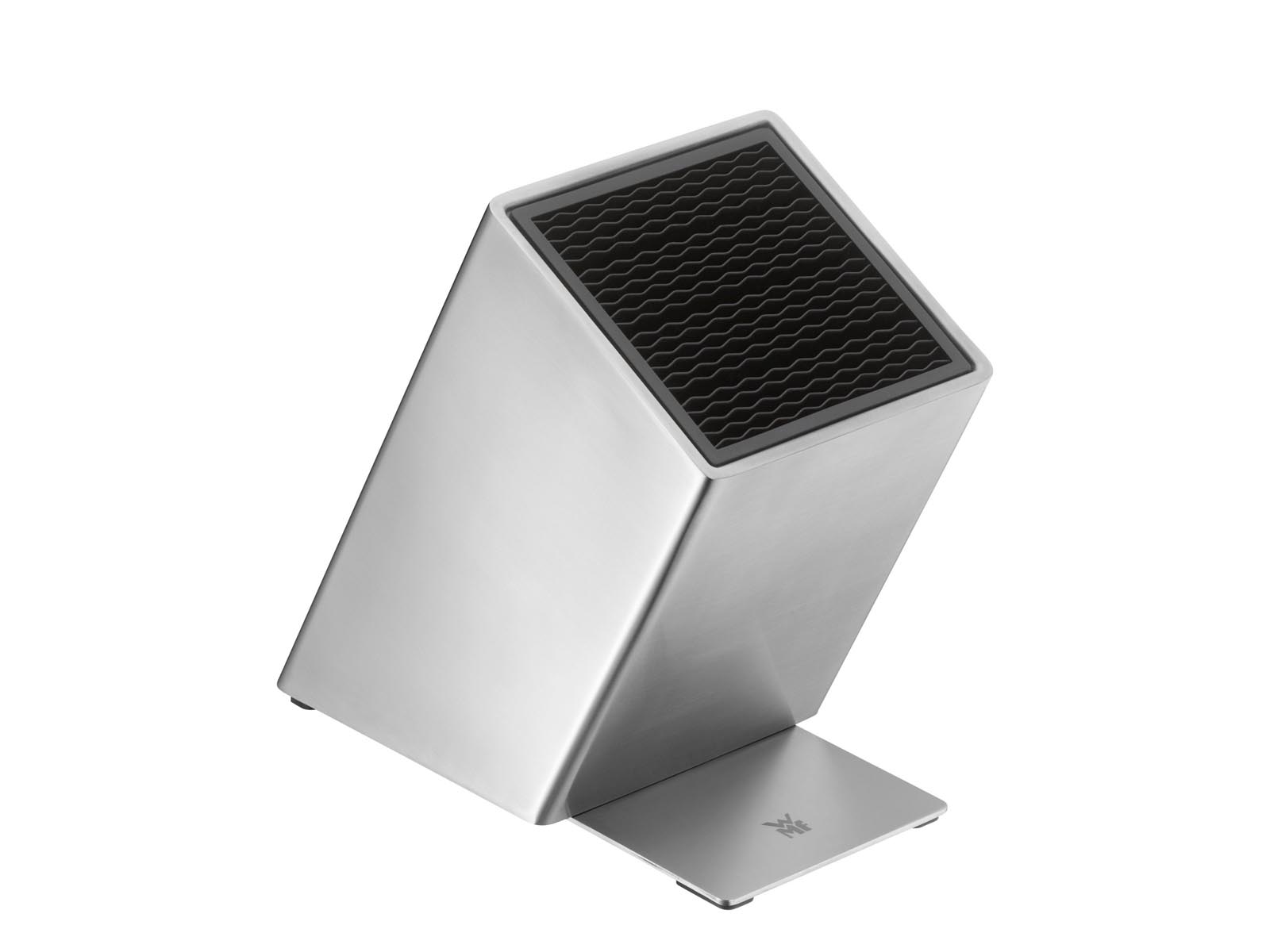 Pojemnik bloku wykonany z wysokiej jakości stali nierdzewnej Cromargan® w prostokątnym kształcie, ustawiony względem blatu pod kątem ze specjalną stabilizującą metalową podstawą zapobiegającą jego przechylaniu się.