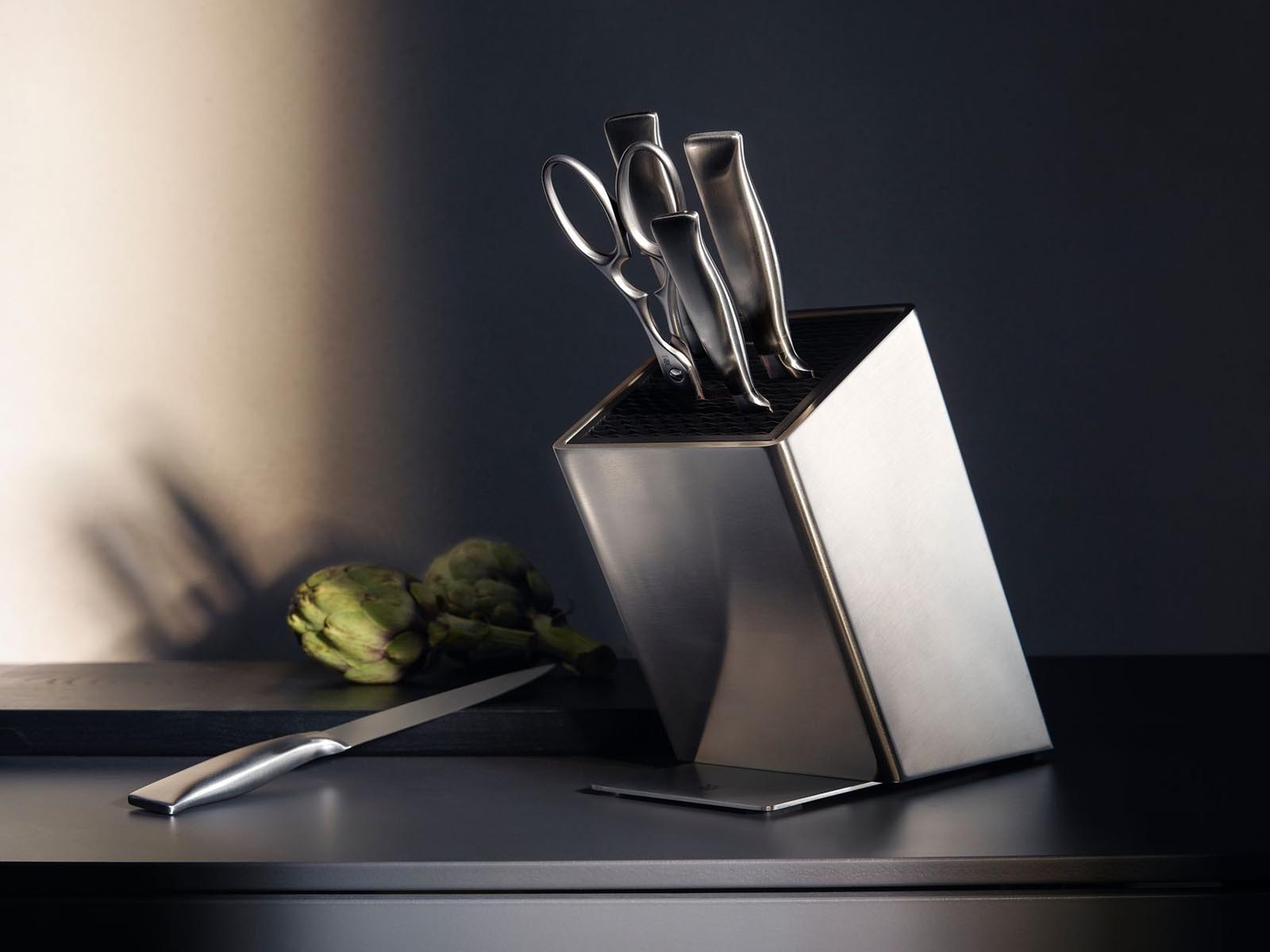 Elegancki i praktyczny zestaw noży kuchennych wraz z nożyczkami kuchennymi z serii Grand Gourmet z nablatowym innowacyjnym stojakiem FlexTec do ich przechowywania. Seria noży Grand Gourmet zaprojektowanej przez znanego japońskiego projektanta Makio Hasuike.