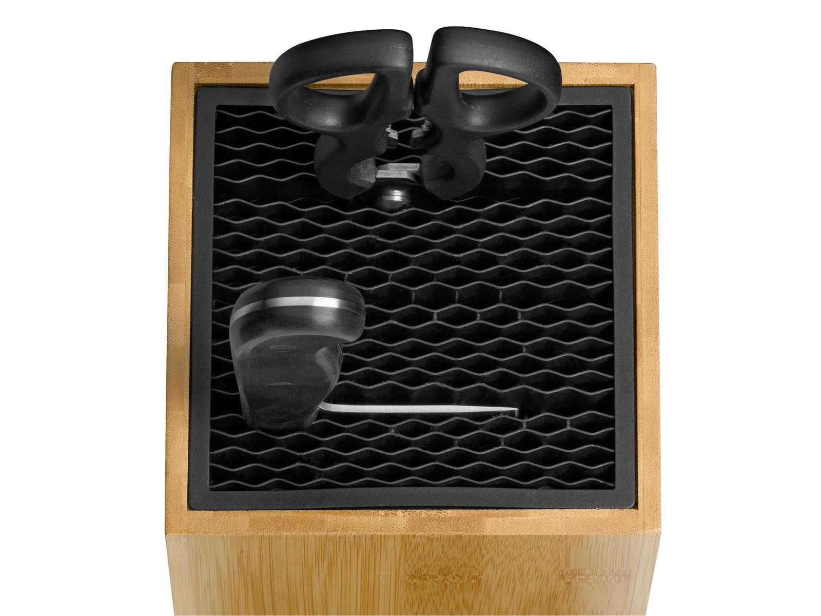 Wewnątrz pojemnika stojak posiada warstwową elastyczną wkładkę z tworzywa sztucznego ze szczelinami utrzymującymi bezpiecznie ostrza noży wewnątrz - stojak umożliwia przechowywanie do 15 noży wszystkich typów i kształtów.