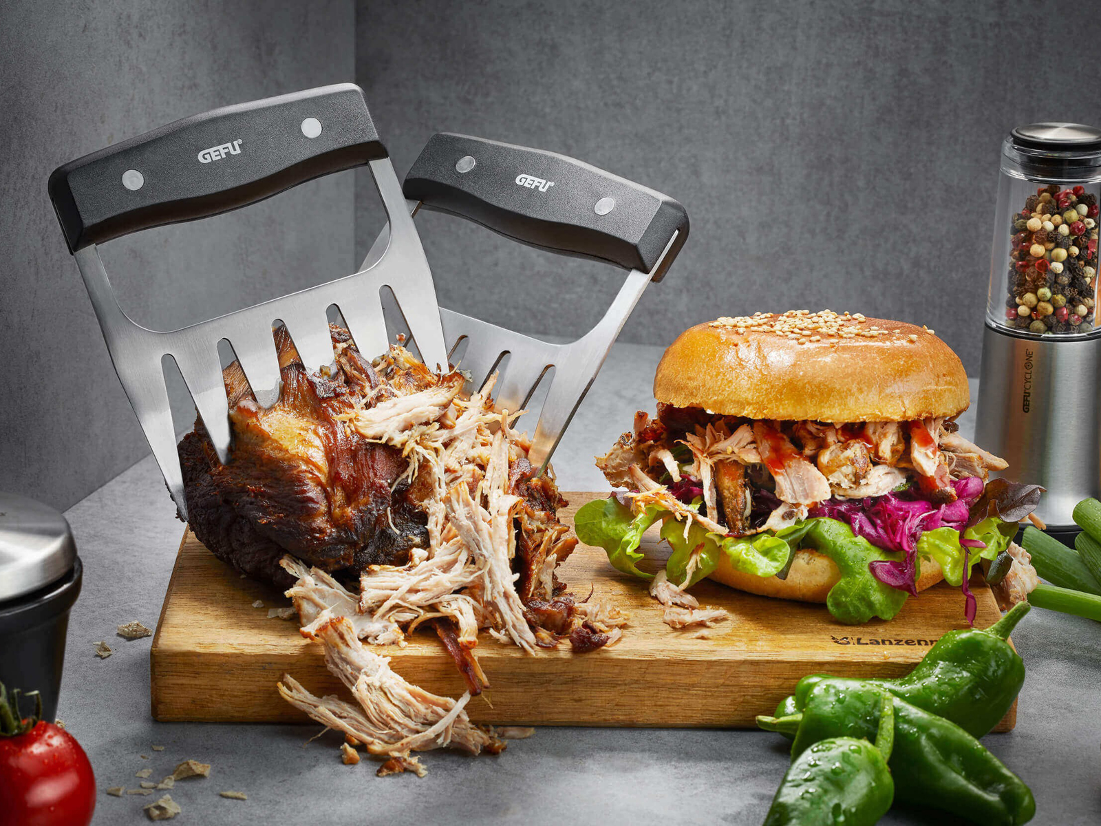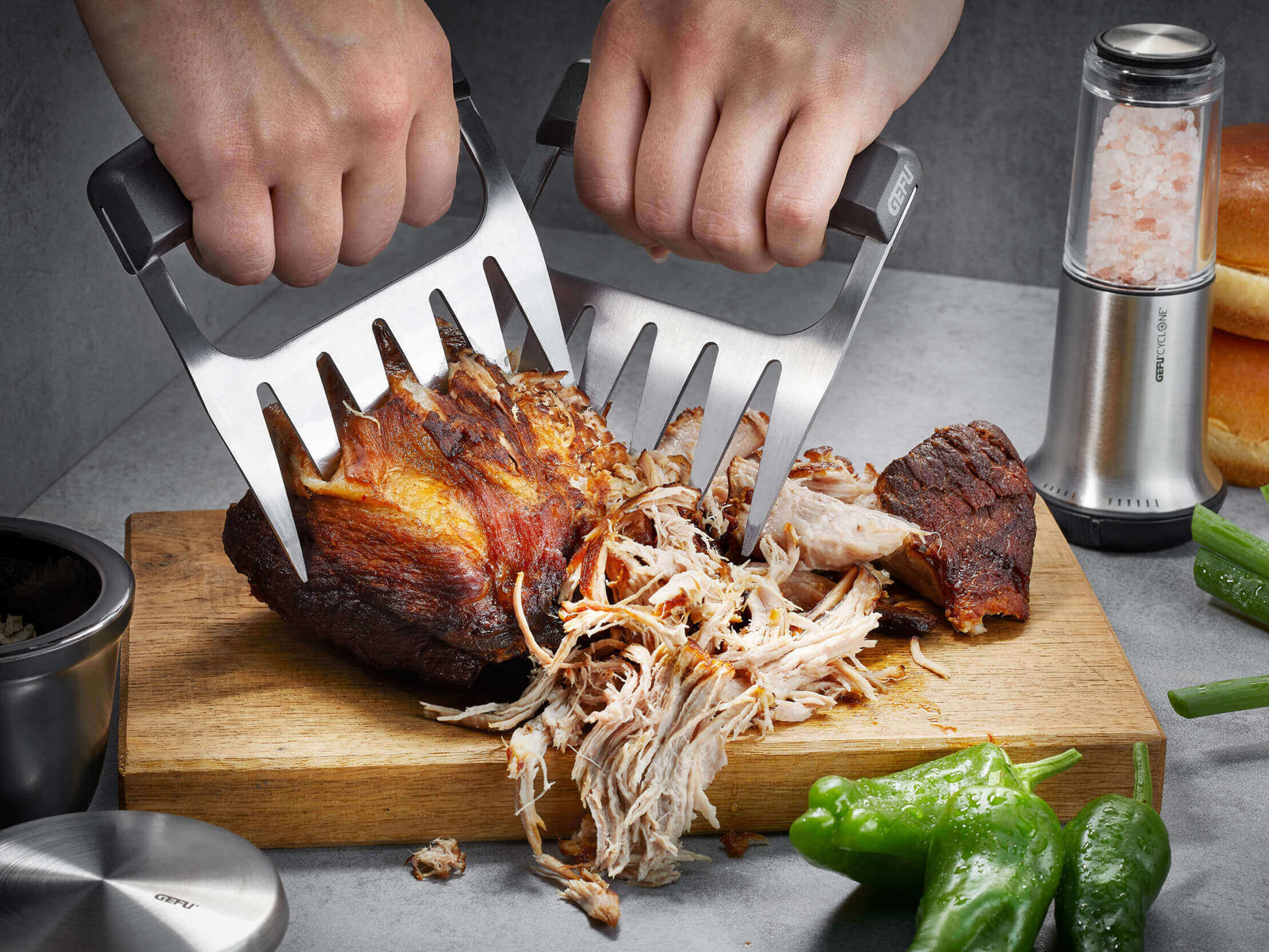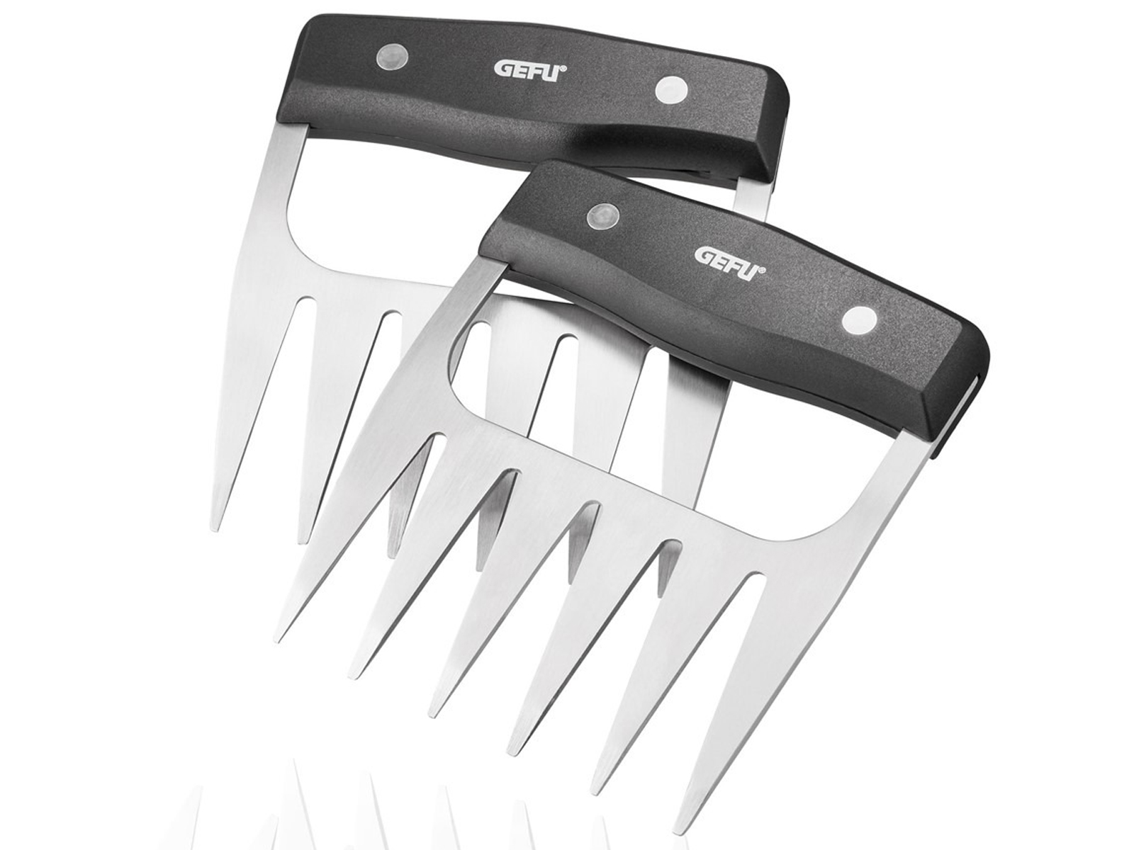 Pazury GEFU BBQ to doskonałe przyrządy do przygotowywania najróżniejszych mięsnych dań, min.: szarpanej wieprzowiny, rozdrobnionej wołowiny czy pieczonego kurczaka. Te specjalistyczne narzędzia wykonane z wysokiej jakości stali nierdzewnej i tworzywa sztucznego ułatwiają chwytanie i szarpanie soczystych kawałków mięsa prosto z grilla. Ergonomicznie ukształtowane uchwyty zapewniają stabilny chwyt, a uniwersalność pazurów sprawia, że nadają się również do mieszania sałatek. Dodatkowo, możliwość mycia w zmywarce upraszcza utrzymanie higieny.