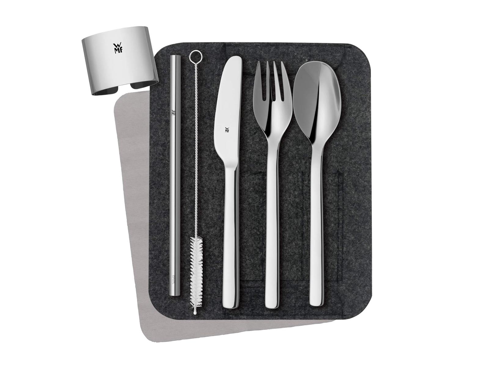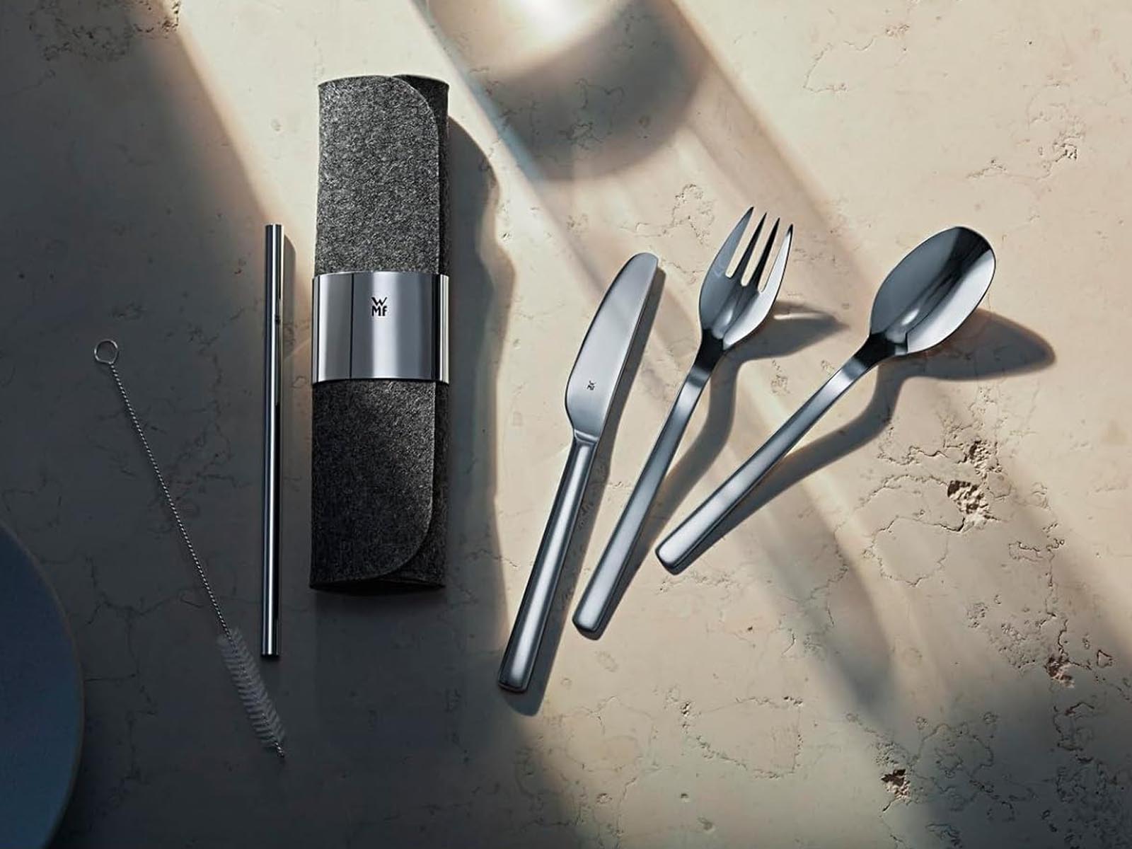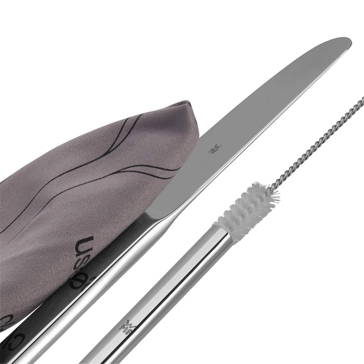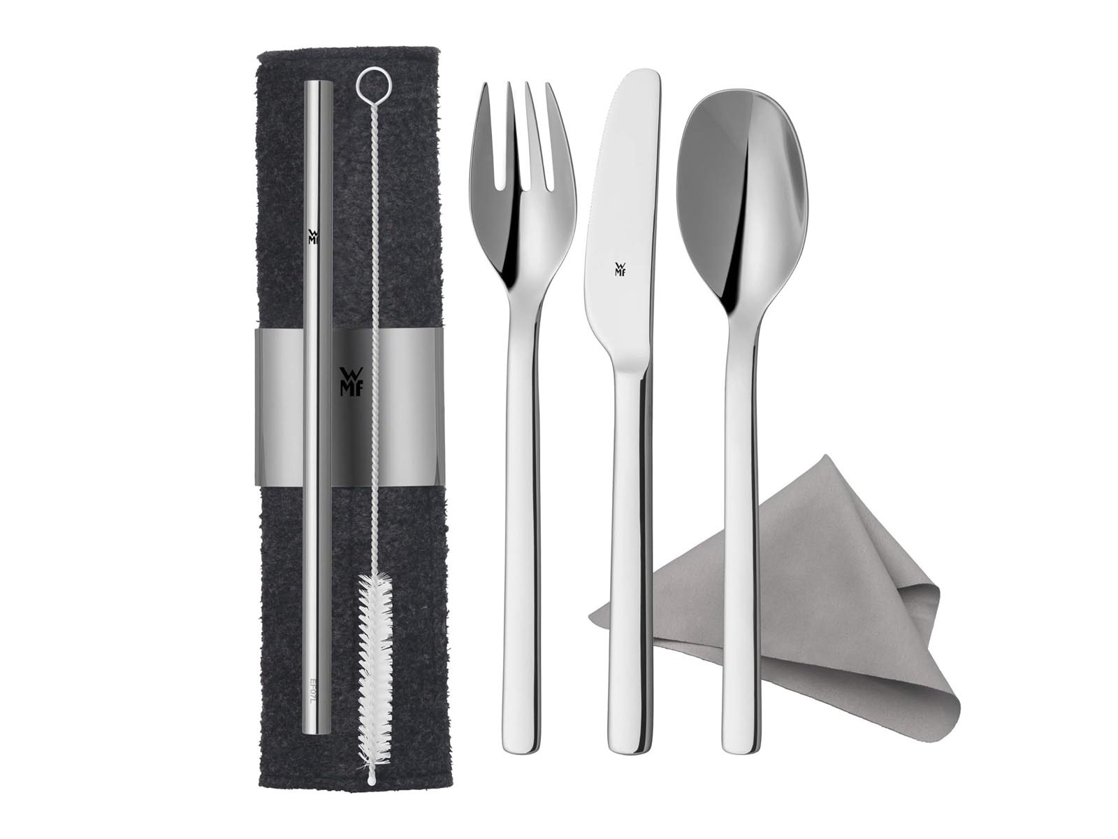 Sztućce, słomka, szczoteczka do słomki oraz klips do etui wykonane z odpornej na zarysowania i kwasy owocowe polerowanej stali nierdzewnej Cromargan®.