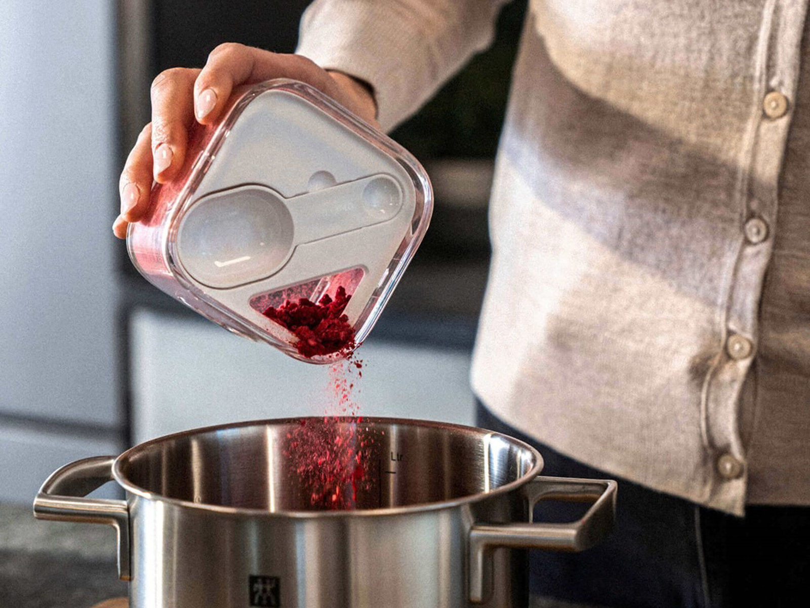 Kolekcja Zwilling Fresh & Save Cube wykorzystuje nowoczesny system przechowywania suchych składników, łącząc estetykę i wygodę użytkowania. Modułowa konstrukcja z antypoślizgowymi podstawami pozwala na swobodne ustawianie pojemników w spiżarni, szufladzie lub na kuchennym blacie, dzięki czemu ulubione produkty mogą być uporządkowane w jednym miejscu. Ścianki i pokrywki pojemników wykonane są z wysokiej jakości tworzywa wolnego od BPA, przypominające szkło i odporne na zarysowania. Chronią zawartość przed wilgocią i powietrzem, wydłużając tym samym jej świeżość. Możliwe do zeskanowania etykietki NFC na pokrywki pozwalają połączyć się z aplikacją Zwilling, która ułatwia kontrolę magazynowania zapasów. Wszystkie pojemniki są przystosowane do mycia w zmywarce i kompatybilne z pompką próżniową Zwilling Fresh & Save, która jest do zakupienia osobno. Kolekcja dostępna jest w różnych rozmiarach, dzięki czemu można ją idealnie dopasować do własnych potrzeb.