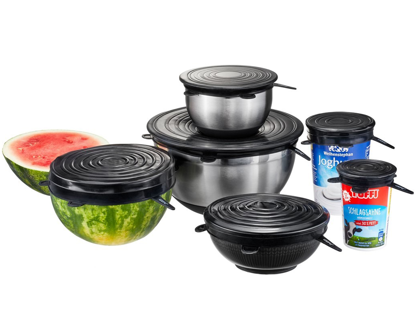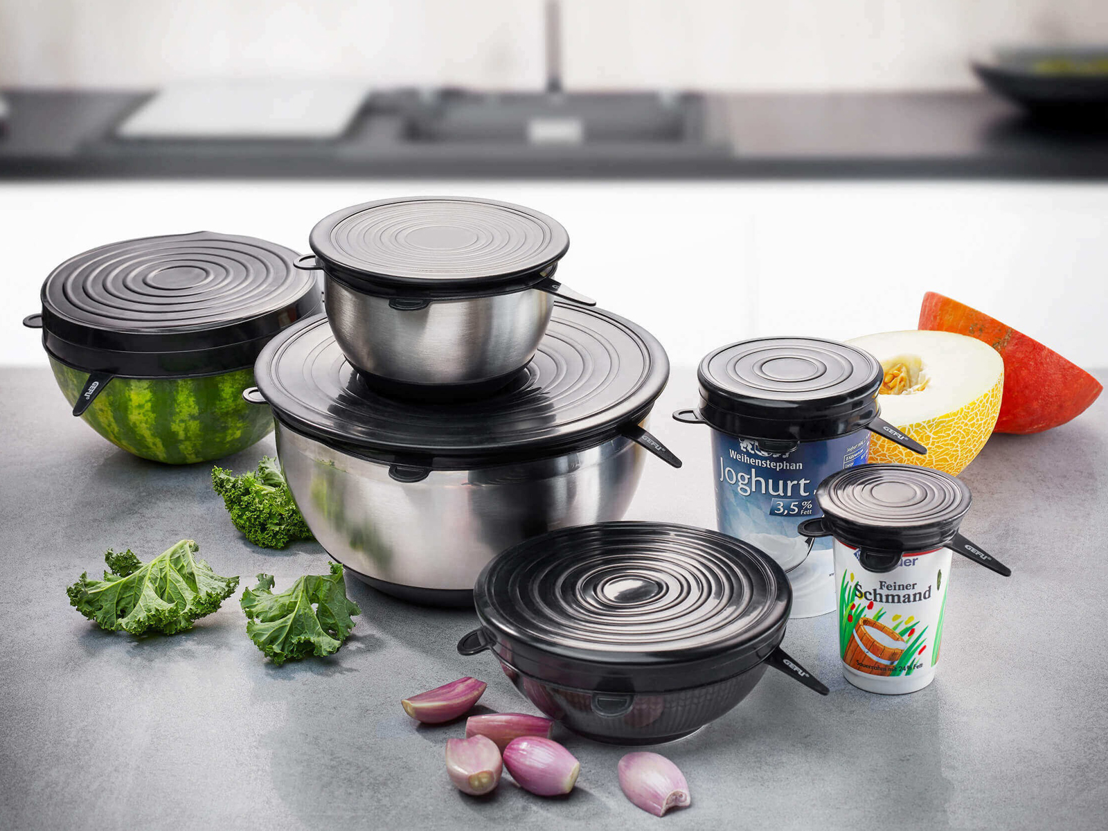 Zestaw pokryw silikonowych GEFU Flexifresh to ekologiczne rozwiązanie, które skutecznie przedłuża świeżość produktów spożywczych.