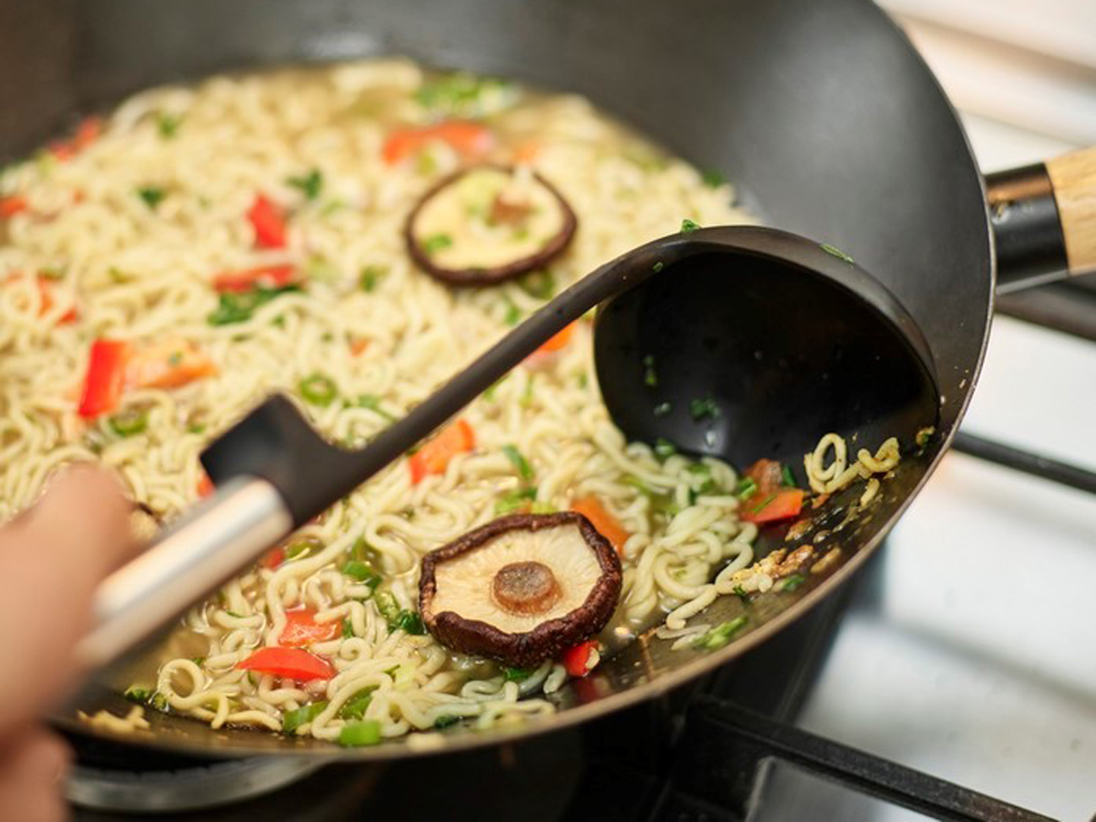 Zestaw przyborów kuchennych z kolekcji Elevate Fusion umożliwia wygodne mieszanie, nalewanie, obracanie oraz serwowanie różnorodnych potraw. W skład kompletu wchodzi łopatka, chochelka, szczypce i dopasowany stojak.