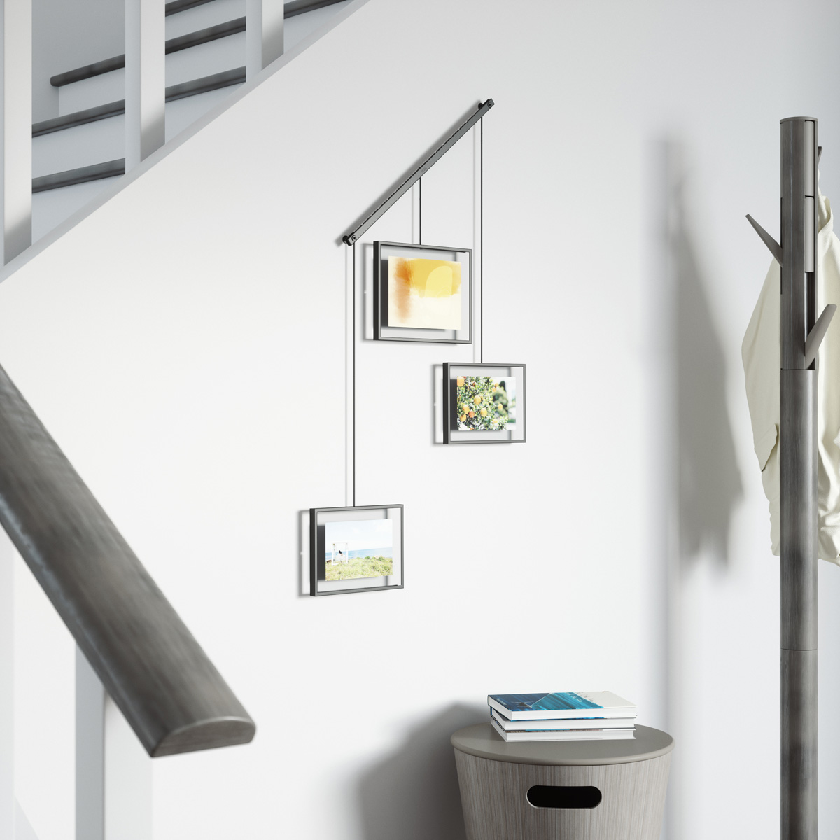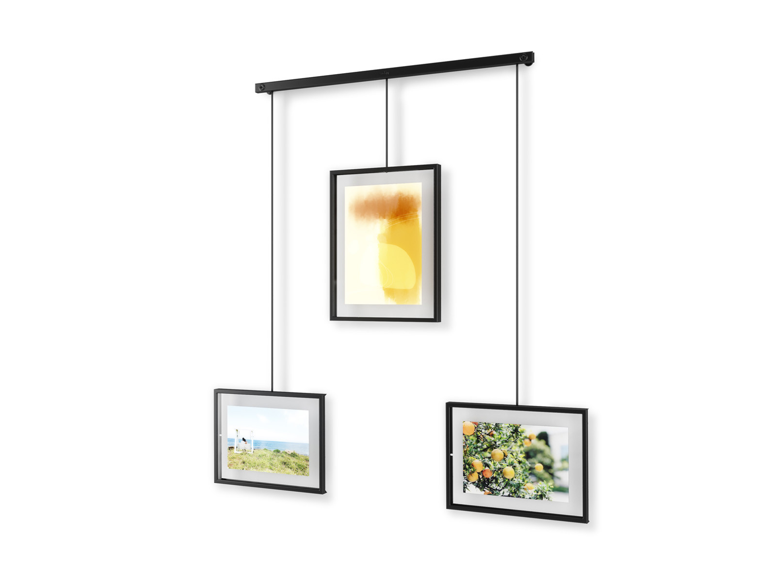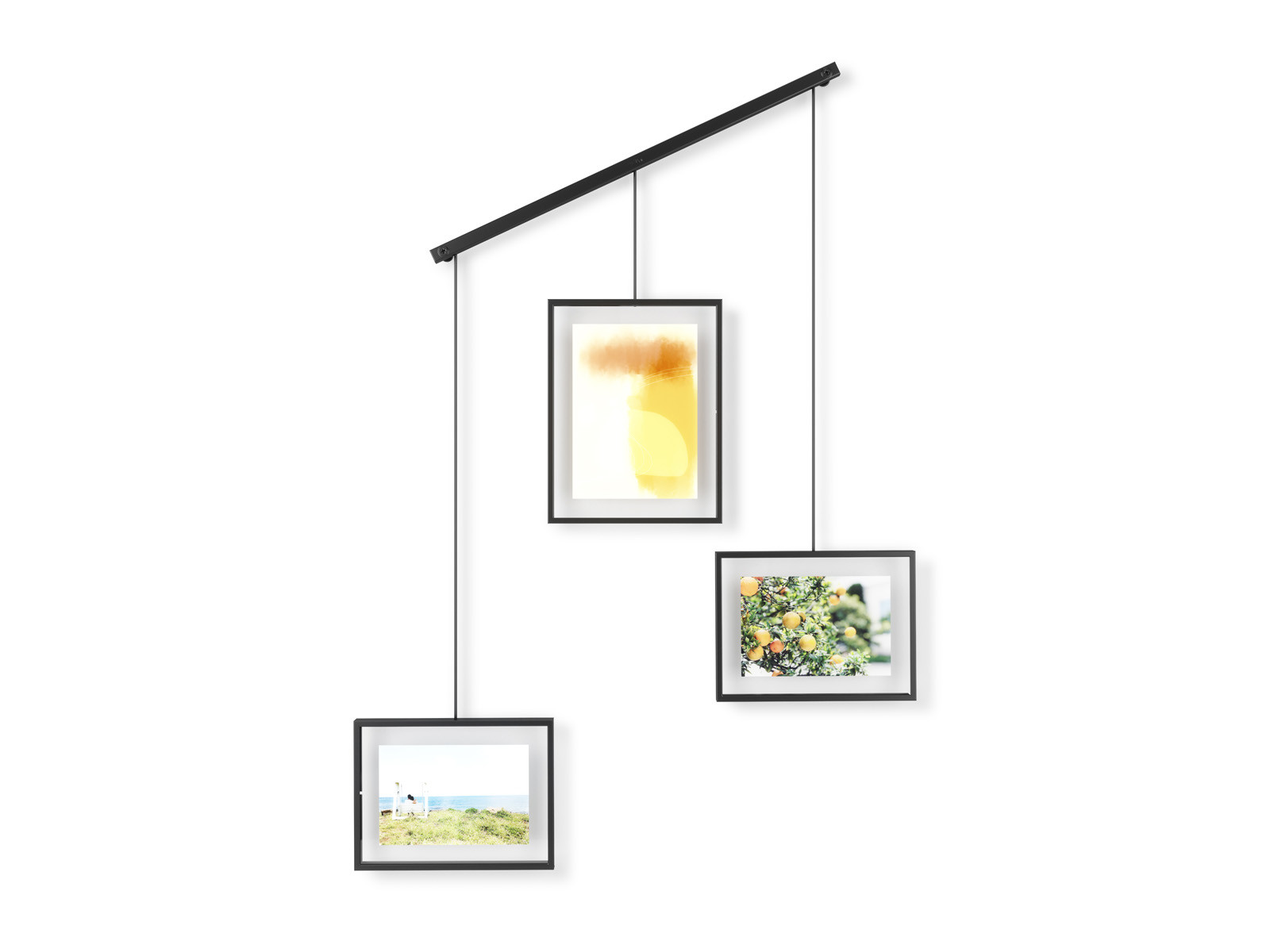 Oryginalny zestaw 3 eleganckich metalowych ramek na zdjęcia zawieszonych na długich ramionach zaczepionych na poprzeczce.