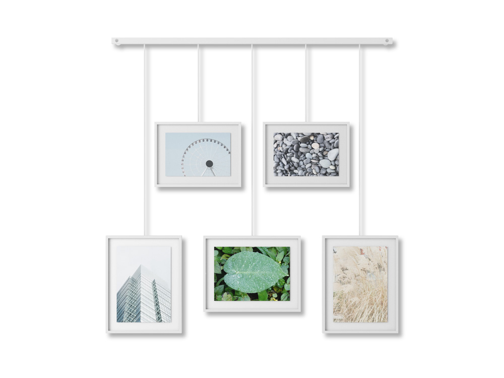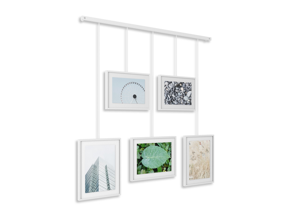 Oryginalny zestaw 5 eleganckich metalowych ramek na zdjęcia zawieszonych na długich ramionach zaczepionych na poprzeczce. Poprzeczka do montowania na ścianie poziomo lub pod skosem, jej konstrukcja umożliwia przesuwanie ramion i tworzenie różnych układów ramek - w zestawie znajdują się elementy do mocowania poprzeczki na ścianie.