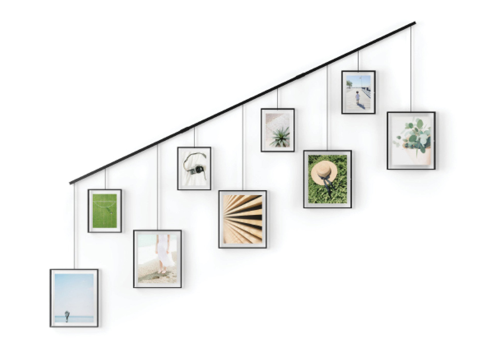 Poprzeczka do montowania na ścianie poziomo lub pod skosem, jej konstrukcja umożliwia przesuwanie ramion i tworzenie różnych układów ramek - w zestawie znajdują się elementy do mocowania poprzeczki na ścianie.