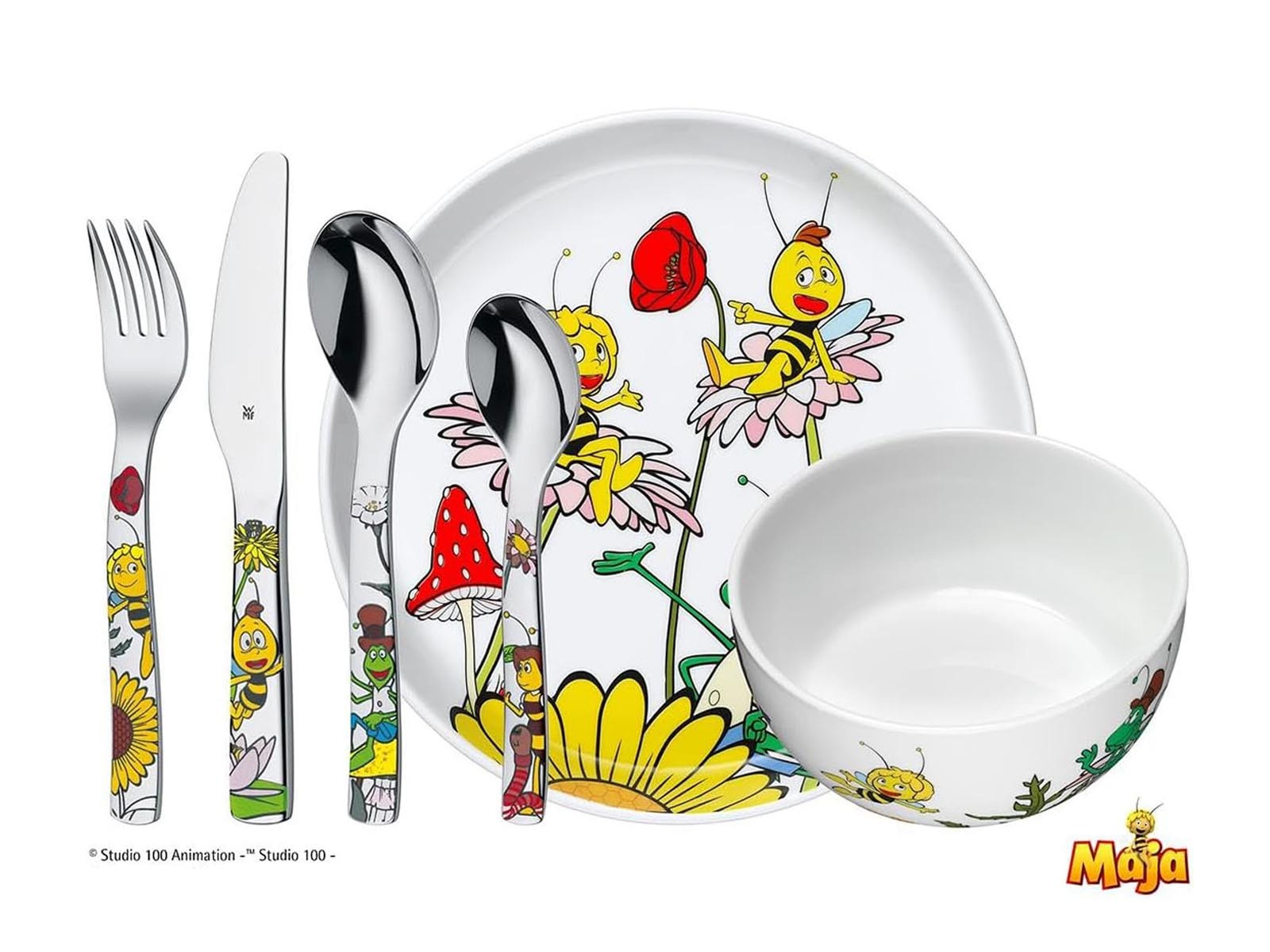 Elegancki kolorowy stołowy zestaw naczyń i sztućców dla dzieci z motywem bajkowym Pszczółka Maja.