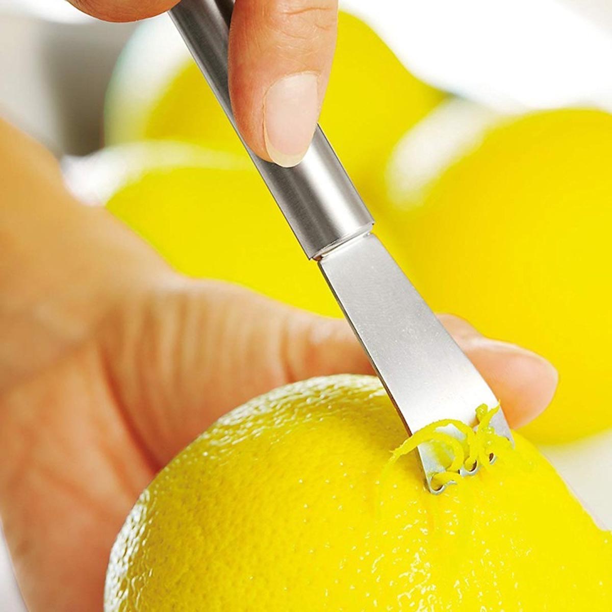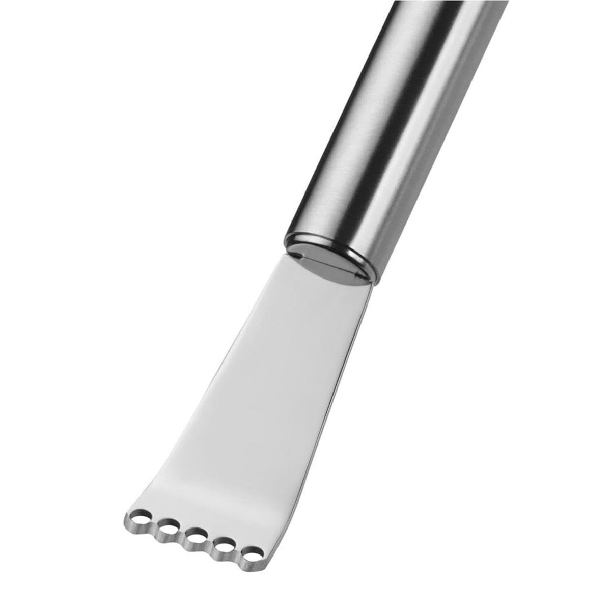 Wygięta końcówka z ząbkowanym ostrzem i umieszczonym nad nim rzędem otworów, pozwala sprawnie i szybko oddzielić aromatyczne paski skórki od reszty owocu.