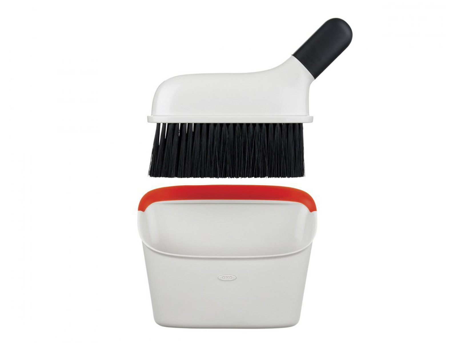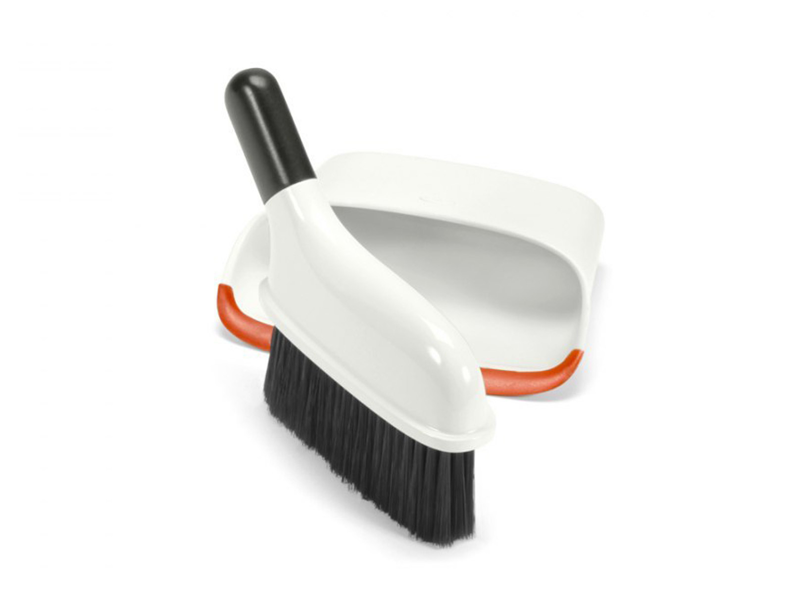 Praktyczna kompaktowa zmiotka z szufelką do zamiatania okruchów, pozostałości produktów żywnościowych i innych niewielkich zabrudzeń ze stołu, blatu oraz innych powierzchni kuchni i domu.